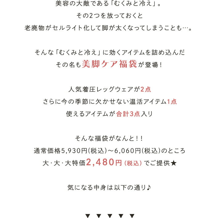 内容 ・魔法のキュットスリム・ハイソックスシリーズから1点 ・Bon!キュ~シリーズから1点 ・裏起毛レッグウォーマー1点 サイズ Mサイズ・Lサイズ・LLサイズ ご注意 ●画面上の色は、ブラウザや設定により、実物と多少色具合が異なって見える場合もございます。予めご了承ください。魔法のキュットスリム入り!美脚ケア福袋 Mサイズ/Lサイズ/LLサイズ ▼詳細は画像をクリックして各商品ページでチェック▼ ▼詳細は画像をクリックして各商品ページでチェック▼ ▼詳細は画像をクリックして各商品ページでチェック▼