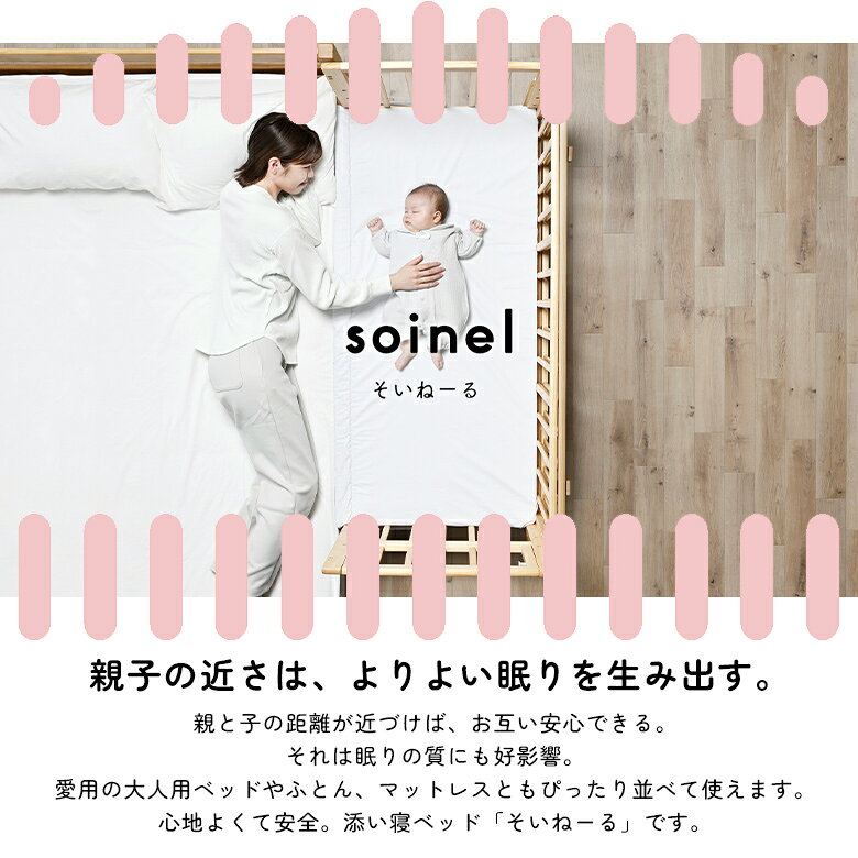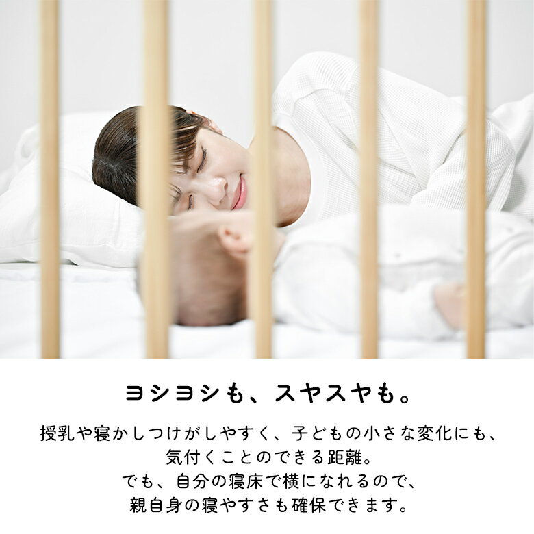 商品説明 「そいねーるAD ラージベビーベッド」は、親子が自然に寄り添える距離で眠れる添い寝対応ベビーベッドです。 お使いのベッドや布団の高さにぴったり合わせられるため、授乳や寝かしつけがしやすく、赤ちゃんの様子をすぐに確認できます。 高さは28段階で細かく調整可能。床寝スタイルでも、ベッド使用でもぴったり並べて使えます。 PSC・SGマーク取得の安心設計で、安全性を重視した構造。赤ちゃんの成長を見守るロングライフモデルです。 専用マットレスとサポートベルトが付属しており、大人用ベッドとの固定も簡単。 足元の開閉扉でお世話もスムーズに行えます。キャスター付きで移動もラクラク。 天然木パイン材のやさしい質感が、お部屋をあたたかく包み込みます。 対象年齢:新生児~6歳頃(ベビーベッドとしては24ヶ月以内) ※ご使用状況や成長には個人差があります。 ※過度な荷重や複数人数でのご使用はお避けください。 商品サイズ (約)幅147.5×奥行70×高さ(最大)126.5cm 床板高さ:28段階調節可能(最上段66cm~最下段11.5cm) 対応ベッド高さ:最大66cm(フレームはみ出し2.5cm未満) マットレスサイズ:(約)幅135×奥行65×高さ5cm 商品重量 (約)21kg 耐荷重 50kg 仕様・材質 本体:天然木(パイン材)、化粧合板 塗装:ラッカー塗装 敷マットレス:生地・綿100%、中綿・ポリエステル100%(固綿) 梱包 梱包サイズ:(約)W1450×D735×H200mm 梱包重量:(約)25.5kg 組み立て お客様組立品 製造国 ベトナム 特典 スペシャル特典「タクタイルソックス キツネ」をプレゼント! かわいいデザインで、お子さまの足元をやさしく包みます。 検索語 そいねーるAD ラージ ベビーベッド 添い寝ベッド 新生児~6歳 PSC認証 SG基準 安全設計 大和屋 yamatoya ソイネール soinel 木製ベビーベッド キャスター付き 高さ調節 ナチュラル ホワイト 出産祝い 出産準備 ベビー家具 赤ちゃん用品 ファースト家具 正規品 子育て安心モデル