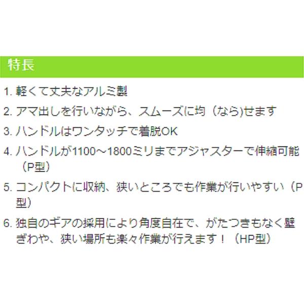 【法人限定】お届け先は法人名(企業名)でお願いします 【北海道・沖縄・離島 別送料】ご注文後こちらからご連絡いたします 【メーカー直送】お客様都合による返品交換はできません ※画像は代表画像です。ご購入前に仕様をご確認下さい。 ■メーカー:(株)友定建機 ■製品名:アルミスクリード ポータブル ■型式:TAS-1800P ■ハンドル長さ:1100〜1800mm ■ブレード寸法:L1800×W80mm ■質量:3.5kg ●特徴 ・軽くて丈夫なアルミ製 ・アマ出しを行いながらスムーズに均(なら)せます ・ハンドルはワンタッチで着脱OK ・ハンドルが1100〜1800ミリまでアジャスターで伸縮可能(P型) ・コンパクトに収納、狭いところでも作業が行いやすい(P型) ・独自のギアの採用により角度自在でがたつきもなく壁ぎわや狭い場所も楽々作業が行えます(HP型) ■商品コード:52500030 ■JANコード:4997581223187 ■管理コード:HI230友定建機 アルミスクリード ポータブル TAS-1800P 2
