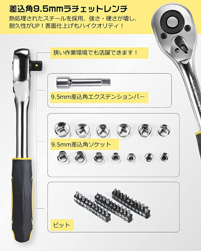 豊富な内容:ドライバー 、ドライバーハンドル、精密ドライバーセット、モンキーレンチ、六角棒スパナ 、ラジオペンチ、オープンエンドレンチ、ネールハンマー、ラチェットレンチ、ソケット、エクステンションバー、水平器、絶縁テープ、巻尺、ビットセット、部品セットが備え、家庭用修理工具として、一本あれば十分です。 耐久性ある材料:すべての工具がクロムバナジウム鋼(CR-V)と熱処理された炭素鋼を採用、スチールの強さと硬さが増し、耐久性が高い! 使用シーンが幅広い、初心者でも使える工具セット:108点の必要な工具が付属されて、自分で自転車やバイクなどの整備、家具などの組み立てや家電のお手入れにも、DIYなど趣味にも、工具セットは大活躍。地震や台風などの災害時には脱出・救助にも使えます。工具セットを家庭に常備しておけば、幅広いシーンで役立ちます! ケース付き、収納や持ち運びに便利:工具の形状に合わせてPEで作られるケースが付き、工具の数が多くてもすっきりコンパクトに収まります。持ち運びに便利のうえに、管理しやすく、細かいツールの紛失防止にも役立ちます。 工具規格 六角棒スパナ:1.5/2/2.2/3/4/5/5.5/6 巻尺:3M ドライバー :プラス+マイナス ドライバーハンドル:6mm 精密ドライバーセット:PH0/PH1/2-/3- モンキーレンチ:200*24mm ラジオペンチ:6" オープンエンドレンチ:8/10/11/3/14/16 水平器:230mm 絶縁テープ:5m ネールハンマー:280mm 部品セット:5/6/8 ラチェットレンチ:3/8 ソケット:8/10/12/13/14/15/16/17/18/19/20/21/22 エクステンションバー:3/8 ビットセット:2-/3-/6-/7-/T10/T15/T20/T25/T27/T30、PH1/PH3/PZ1/PZ3/H2/H3/H4/H5/H6/AD、5-/6-/PH1/PH2/H2/H3/H4/T15/T20/T25 ※当店ではお客様都合による交換、返金は受け付けておりません。 ■お客様都合によるキャンセル(商品発送前) ご注文から30分以内は、理由の有無を問わず購入履歴からキャンセルすることが可能です。 なお、当店では、ご注文から30分以上過ぎた場合、お客様都合によるキャンセルは承っておりません。 あらかじめご了承ください。 ◇ 配送方法について ◇ ※ 発送後のキャンセル・送付先の変更はできません。 ※ 届かない場合や、転居による紛失に関しての補償は一切ありません。ご注文前に、送付先に誤りがないか、部屋番号抜け等がないかを必ずご確認ください。 ※ 長期不在・表札がない・表札や郵便受けに書かれたお名前がご注文者のお名前と異なる場合、お届けができず自動的に返送となる場合がございます。返送された場合、返送・再配達にかかる送料はお客様負担となります。ご了承ください。 ◇ 注意事項 ◇ ★ ご利用のモニターによって、実物と異なる色に表示される場合がございます。 ★ 製造時期によりデザインや仕様に若干の変更がある場合がございます。ご了承ください。 ※ 全商品、北海道・沖縄・離島は別途 送料が掛かります。 ※ ラッピング対応しておりませんので、ご了承ください。 ※ 商品取り扱いご注意 ※ 説明書は日本語化されていません。 ※本商品は新品未使用品ですが、輸入品のため、汚れや傷・ムラがある場合がございます。ご了承ください。