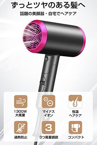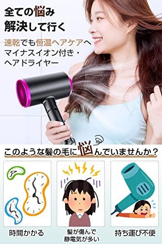 【2024革新型・大風量・速乾】本ヘアドライヤーは最新バーションの強力モータを採用、高速で安定した気流を生成でき、髪にダメージを与えずに数分間以内に根元から髪を乾燥することができます。驚くほどの大風量で髪をより早く、 毎秒22mの大風量で髪の乾燥時間の短縮可能に。大風量がある一方、電気の消費量が低くて、電気代が節約できます。【高濃度のマイナスイオン発生可】 ヘアドライヤー 速乾は、髪にやさしい高濃度のマイナスイオンを発生させます。マイナスイオンの効果で、髪のキューティクルを保護し、しっとりとした美しい髪に仕上げます。静電気を抑え、髪の広がりを防ぐため、毎日のヘアケアが楽になります。さらに、髪に潤いを与え、ツヤと柔らかさをキープします。乾燥によるダメージを最小限に抑え、健康的な髪を維持するための理想的なアイテムです。【温度過昇防止・恒温ケア】1300Wの高性能のDCモーターを採用し、高速で安定した気流を生成し、1.6㎥/minの大風量を実現し、ドライ時間を短くすることができ、髪への熱ダメージが減少されます。また、内蔵温度センサーが風温を自動的に測定し、温度を一定に保つことができます。髪の毛に均等に風を当てて乾かすため髪を傷めずソフトに仕上げ、キューティクルを保護しながらヘアカラーの退色を抑制します。【冷熱風3段階調節・簡単にスタイリング】冷風・熱弱風・熱強風の3つのモードが搭載しており、お好みに合わせて使用することができます!いち早く髪を乾かしたい時は熱強風、カラーリングした髪の色を長らくキープしたい時は熱弱風、夏場やヘアスタイルの仕上げ時は冷風、様々なシーンでの使い分けも簡単。上記の3モードのほか、本冷熱風ドライヤーは冷熱切替ボタンもついており、熱風と冷風の切替は今以上にシンプル!【プレゼントにも最適】高級感の色でファッションな気分になれるアイテムだからこそ、頑張っている方への感謝の気持ちとしてのプレゼントにもピッタリ。シンプルでおしゃれなデザインなので男性が使ってもよいです。また、過熱保護装置が付き、ヘアドライヤーが危険な温度まで上昇すると自動的に電源を中断することになります。子供・お年寄りにも安心してご使用できます。説明 一般的な ドライヤー よりも大風量で、あっという間に髪を乾かします。長い髪を早く乾かしたい方に最適です。さらに、3つのモードがあり、スイッチひとつで、自分の好きなようにモードを調整することができます。また、温風モードで素早く冷風に切り替えられるクールモードボタンも装備しています。