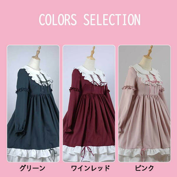 ロリータ ビッグカラー ワンピース クラロリ 単品 ゴスロリ 長袖あり 袖付き Aライン Lolita リボン フリル裾 クリスマス レディース コスチューム 衣装 かわいい 仮装 パーティ お茶会 学園祭 文化祭 デート イベント ファッショングローリーパーク