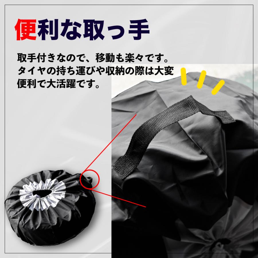 厚手タイヤカバー4枚セット 通気性、防水?撥水性に優れる高品質ポリエステル素材を使用しており、 その耐久性や耐水圧はアウトドアテントと同等の強度なので、大切なタイヤをしっかりと守ります。 使わないときは付属の収納袋にコンパクトに収納でき、省スペースで保管できます。 カラー ブラック (厚み210D) シルバー×ブラック (厚み190D×210D) サイズ (S)直径65×幅37cm 目安: 軽自動車 / コンパクトカー / 小型?中型 セダン ( プリウス ) / ミニバン など (L)直径80×幅47cm 目安: 大型 セダン / クーペ / ワゴン ( アルファード ヴェルファイア ) / SUV / ハイエース など タイヤサイズ 13インチ 14インチ 15インチ 16インチ 17インチ 18インチ 19インチ 20インチ