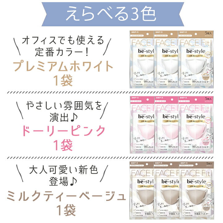 1袋5枚入×1袋 ビースタイル be-style 立体の紹介 小顔に魅せるフィット感!女性用おしゃれ立体マスク。 「スマートカット」でアゴのラインすっきり美シルエット。 メイクがつきにくいやさしい肌ざわり。 0.1μmの微小粒子カットの不織布フィルター採用。 商品名:ビースタイル be-style 形状タイプ:立体型マスク(ノーズワイヤー無しタイプ) サイズ:普通サイズ パッケージ(幅×高さ×奥行)130×217×16(mm) 本体(幅×高さ×奥行)タテ×ヨコ 138×105(mm) セット内容:1袋5枚入×1袋 カラー:3色(プレミアムホワイト、ドーリーピンク、ミルクティーベージュ) ビースタイル be-style 立体の詳細 見た目スッキリ、キレイにフィットする立体型不織布マスク ●メイクがつきにくい ふわっとしたやさしい肌ざわりの口もと素材。肌に優しいエアスルー素材なので、肌荒れしない。 ●フィルター性能 0.1μmの微粒子・花粉・ウイルス飛沫を99%カット ●唇が触れにくい立体タイプ 平型マスク、プリーツ型マスクと違い、口元に空間ができて呼吸がしやすい。通気性が良いくちばし型 ●跡がつかないラウンドカット マスクをしていても笑顔が伝わる。印象的な目もとを演出。ノーズワイヤーなしでもぴったり美フィット ●ハートのワンポイントつき ●耳が痛くない敏感肌に優しいふんわり幅広耳ひも ●アゴのラインをスッキリみせるスマートカット ※化粧が全く付着しないものではありません。 化粧品の種類や使用量によっては、付着しやすい場合があります。 使い捨て、1日使い切りタイプです。再使用はしないでください。 【フィルター部捕集性能(平均値)】 ●0.1μmの微粒子:99%カット…PFE試験(0.1μm) ●ウイルス飛沫:99%カット…VFE試験(平均約3.0μm) ●バクテリア飛まつ:99%カット…BFE試験 ●花粉:99%カット…花粉捕集効率試験(約30μm) 日本産業規格 JIS T 9001 【対象】 風邪・花粉・ほこり等(家庭用マスク) 風邪対策、ウイルス対策だけではなく、花粉症対策、乾燥対策に。防寒や夜寝る時ののどの保湿にも。 【素材】 本体・フィルタ部:ポリプロピレン、ポリエチレン、ポリエステル 耳紐部:ナイロン、ポリウレタン ※ 蛍光染料は使用していません。 カラーは選べる3色 ・プレミアムホワイト オフィスでも使える定番カラー。おしゃれなつややかな白 ・ドーリーピンク ピンク色でかわいい雰囲気を演出 ・ミルクティーベージュ 肌になじむ大人可愛いベージュ色 当店グラニーレのマスクはプチギフトとしても好評です。 たくさんあっても困らない日用品、消耗品のマスク。 母の日、父の日、敬老の日、誕生日、バレンタインデー、ホワイトデー、クリスマスなど、定番のギフトイベントに、ちょっと気の利いたプレゼントとして贈ってみませんか。 大切な方へのお返し、結婚披露宴・ウエディングパーティ−、2次会のプチギフトなどにもどうぞ。スポーツチームや趣味サークルへの差し入れとして、法人様には粗品、コンペの優勝景品、副賞としてもご利用いただけます。大量注文などご相談ください。 メーカー:白元アース 広告文責:株式会社グラニーレ 富山市黒瀬179-3 ★マスク取り扱い多数! ○メイクがつきにくい ビースタイル 立体タイプ3袋セット 立体タイプ10袋セット プリーツタイプ3袋セット プリーツタイプ10袋セット 涼やか心地3袋セット 涼やか心地10袋セット ◯耳が痛くない 日本製サージカルマスク 耳らくリラマスク 10枚入り 大人用1袋 大人用3袋セット 大人用10袋セット 小さめ1袋 小さめ3袋セット 小さめ10袋セット ◯ユニ・チャーム 超快適マスク SMART COLOR 7枚入 SMART COLORマスク3袋セット SMART COLORマスク10袋セット ◯男女兼用、耳が痛くなりにくい ヨコイ エッセンシャルマスク 30枚入 1個 3個 10個 ◯3D立体 バイカラーマスク 色が選べる2袋セット ◯接触冷感・抗菌防臭・水着素材の綿布マスク グラニーレマスク 色が選べる1枚セット 色が選べる2枚セット ピンクレース1枚 ピンクレース2枚 ★玄関扉にマスクを収納。もう忘れない! 紙製で捨てやすい マグネット マスクホルダー ⇒マスクホルダー 1個 ⇒マスクケース 1個