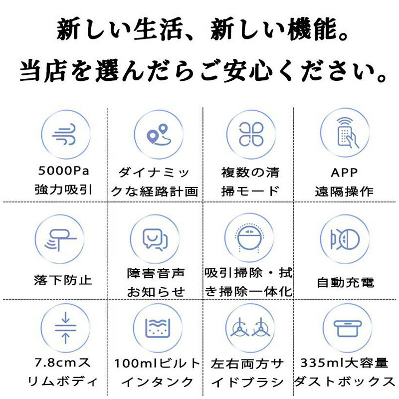 【P2倍★5%OFF】ロボット掃除機 5000Pa 強力吸引 高性能 花粉対策 水拭き両用 超薄型 畳 静音 自動充電 アレクサ WiFi 130分間連続稼働 お掃除ロボット 境界線テープ