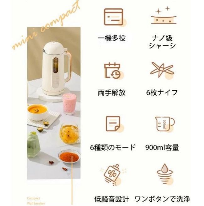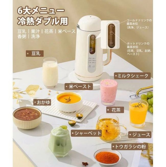 本体サイズ:17*12*30cm ネットウェート:1.67kg 材質:SUS304攪拌カップ カラー:ホワイト セット内容:本体*1、電源アダプター*1 一台多役:この小型豆乳メーカーは豆乳だけではなく、ほかのメニューもあります。このミキサーで花茶?ジュース?お粥?米ペーストなども作れます。赤ちゃんの離乳食などの様々な食材を素早く粉砕し、豊富なお料理に活用できます。家族が好きなものをこの1台で作れます 乾燥豆でもOK?高品質なモーター:大豆を水で浸けず、ワンタッチだけで操作でき、あったか豆乳、コーンジュース、セロリジュースなど。フードレベルステンレス製丈夫な刃ブレード10枚を採用し、優れい400W(加熱)と250W(ミックス)のパワーモーターを搭載します。誰でも手軽に毎日使いたくなり、初心者もぴったりです 大容量タイプ:出来立ての豆乳で良質なタンパク質と食物繊維を摂取でき、新鮮な大豆や野菜など具材に熱を加えて攪拌まで全自動で調理してくれるので、ポタージュが作れます。容量は700ml(温かい飲み物)?900ml(冷たい飲み物)で一度に軽めの1〜3人分は作れます らくらく洗浄機能:使用後は水と台所用中性洗剤を数滴入れ、洗浄モードで簡単にお手入れOK。パワフルに高速回転し、刃の周りの汚れを落とします ●実寸はメジャー採寸の為、若干の誤差が生じる場合があります。 ●色合いはモニター環境により若干の誤差が出ます。 ●品質上は問題ありません。返品交換の対象外とさせていただいております。ご理解いただいた上で、ご購入下さい。 ●お急ぎの方は、期間に余裕をもってのご注文をお願い致します。 ●万が一商品に不具合がある場合は、マイナス評価する前にご遠慮なく当店と連絡してください。 ●モデル写真に使用されているアクセサリー小物は別途記載が無い限り付属いたしません。