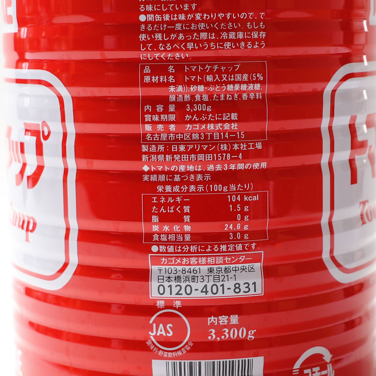 原材料名トマト(輸入または国産(5%未満))、砂糖・ぶどう糖果糖液糖、醸造酢、食塩、たまねぎ、香辛料内容量1号缶甘味、酸味、旨味のバランスがよく、かける、炒める、煮込むなど幅広く利用いただけるJAS標準グレード品です。