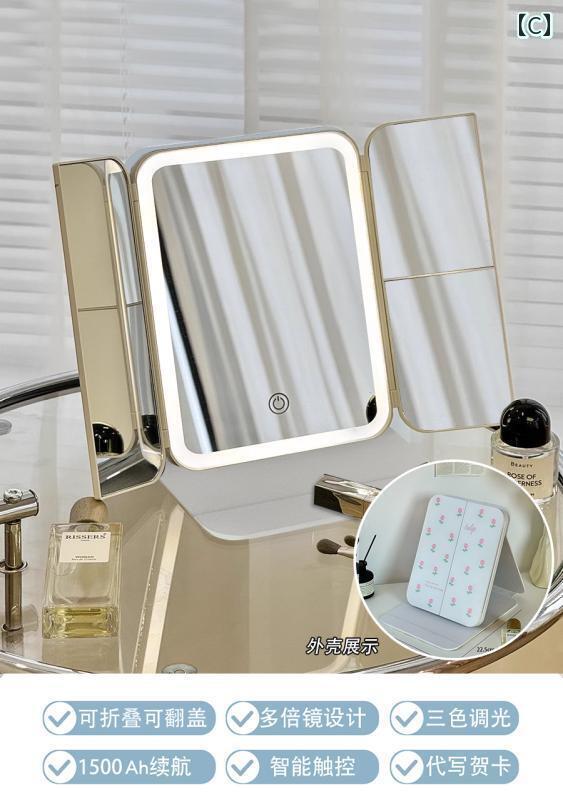 レディース 手鏡 コンパクト デスク トップ ライト 高級 美容 LED 化粧 鏡 付き ポータブル 折りたたみ ミラー シェル 3つ 折り ドレッシング ギフト