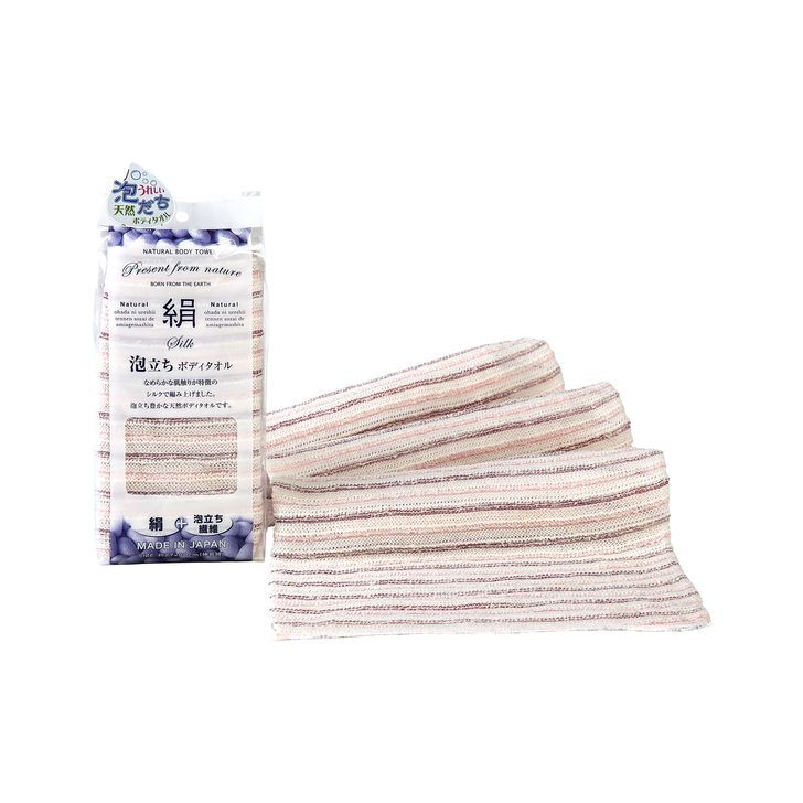 ●肌触りが優しく気持ちよい絹を使用。 ●中糸に泡立ちの良い化繊を使用しているので、泡立ちも良いボディタオル。 ■商品サイズ(約):幅27×奥行き90×高さ0.2cm ■重量(約):46g ■パッケージサイズ(約):幅11×奥行2.3×高さ26.5cm ■素材・材質:ポリエステル・綿・絹 ■生産国:日本