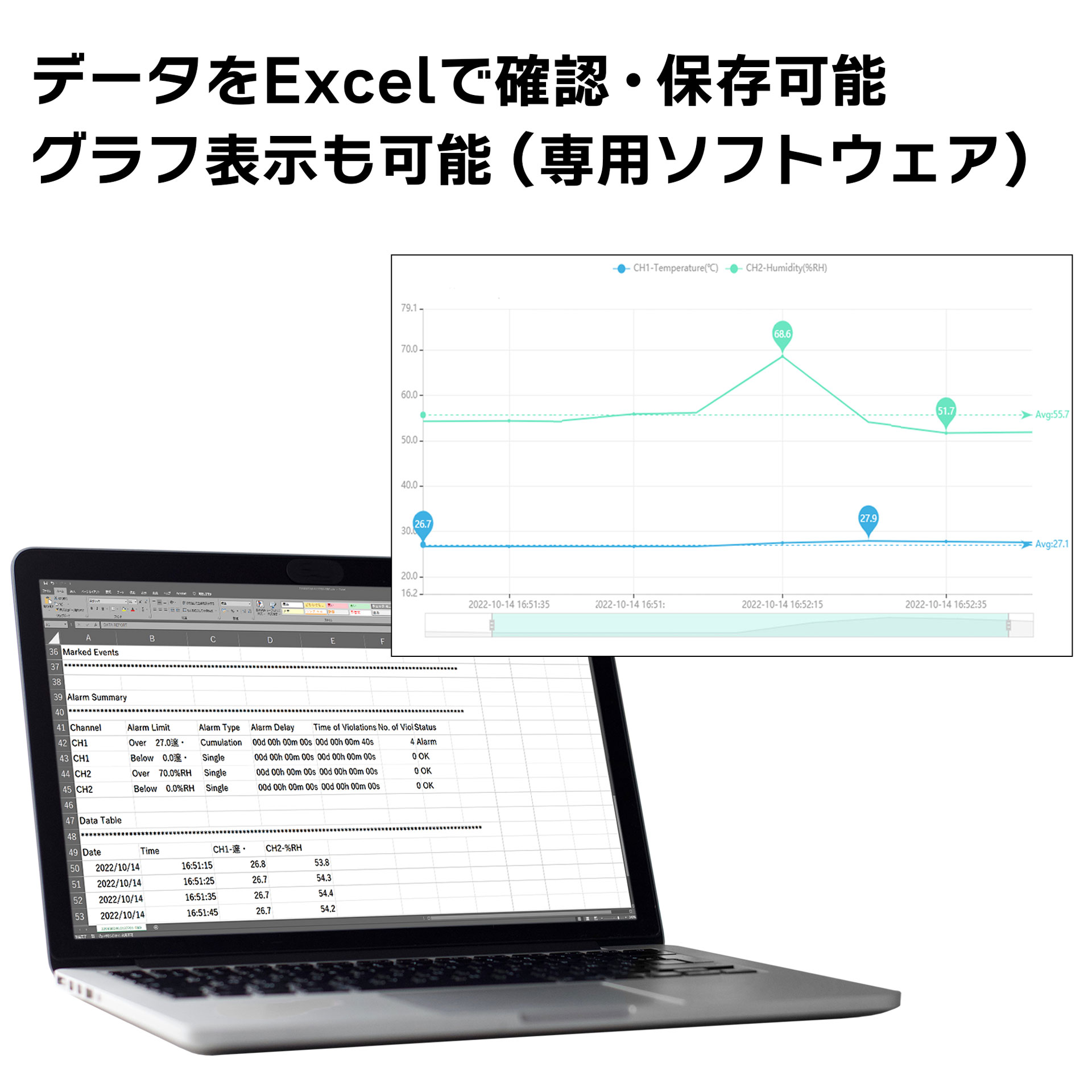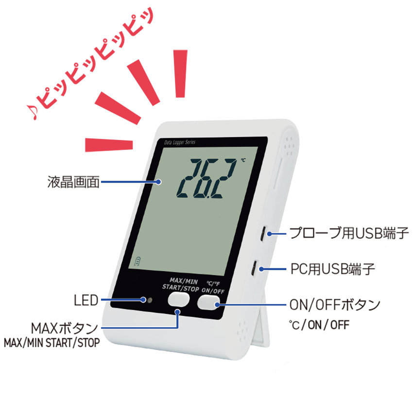 型番 MJ-ADL-11P 商品説明 温度を記録できるデータロガーです。温度に対する感度が高い半導体センサーを採用しており、温度測定範囲は-20?90℃(分解能 0.1℃)、17,280件の記録が可能です。アラーム機能も搭載しており、専用ソフトウェアを使用することで記録したデータをExcel形式で保存し、グラフ化することもできます。 寸法 120×74×25mm 重量 108g