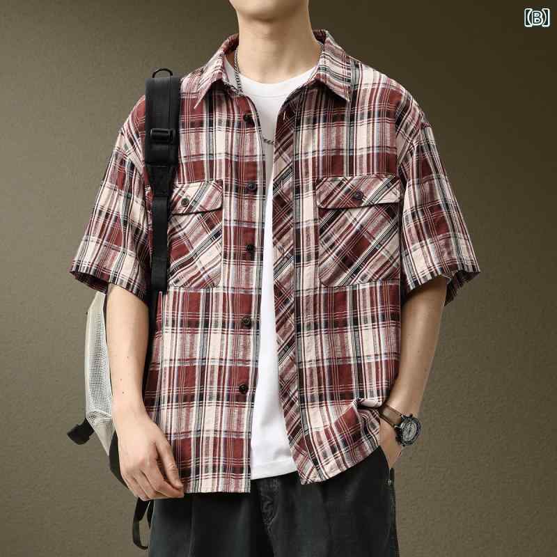 ネルシャツ トップス チェック柄 ストリート スケーター メンズ カジュアル アメリカン 吸湿性 通気性 夏 薄手 半袖 ポケット シングルブレスト お出かけ
