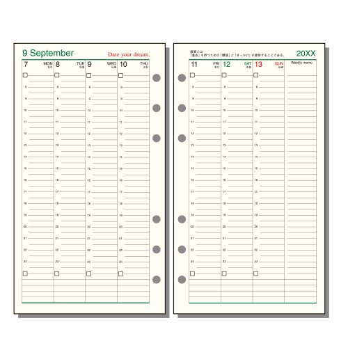 詳細説明【特長】・Dateyourdreamシリーズのリフィルです。・目にやさしいクリーム色が特長です。・軽くて薄く裏移りしづらいトモエリバー使用。・渡邉美樹氏の格言入です。・バーチカルタイプで時間目盛付きなので、時間ごとのスケジュール管理がしやすくなっています。・平日も土日もスペースが均等な1週間均等割りタイプです。 商品仕様(スペック)本体サイズ(約):縦170x横95mmページ数:142ページ(71枚)素材:手帳専用紙対応期間:2025年12月〜2027年3月軽くて薄く裏移りしづらいトモエリバー使用