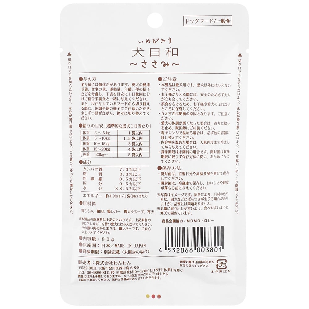 今日はささみをたっぷり。 素材だけで作ったこだわりのレトルトフード。凝縮された鶏の旨みをお楽しみください。国産です!※着色料・発色剤・酸化防止剤・調味料 は使用しておりません。 【原材料】 鶏ささみ、鶏肉、鶏レバー、鶏ガラスープ、寒天 【保証成分】 タンパク質:7.0%以上、脂質:3.0%以上、粗繊維:0.5%以下、灰分:0.5%以下、水分:88.5%以下 【カロリー】 エネルギー:約49kcal/1袋(80g)当たり 【給与量】 体重3~5kg 1袋以内5~10kg 1.5袋以内10~15kg 3袋以内15~20kg 4袋以内20kg以上 5袋以内 ・本製品は愛犬用おやつです。愛犬以外には与えないでください。・愛犬の食べ方や習性によって、喉につまらせる場合があります。必ずよく観察しながら与えてください。 また、噛まずに飲み込むおそれのある愛犬には与えないでください。・愛犬の体調が悪くなった場合は直ちに給与を止め、獣医師にご相談ください。・誤食を避けるため、お子様や愛犬の届かないところに保管してください。・お子様が与える際には、安全のため必ず大人が立ち会ってください。・与えすぎは肥満の原因となります。ご注意ください。 【原産国】日本 【メーカー】株式会社 わんわん