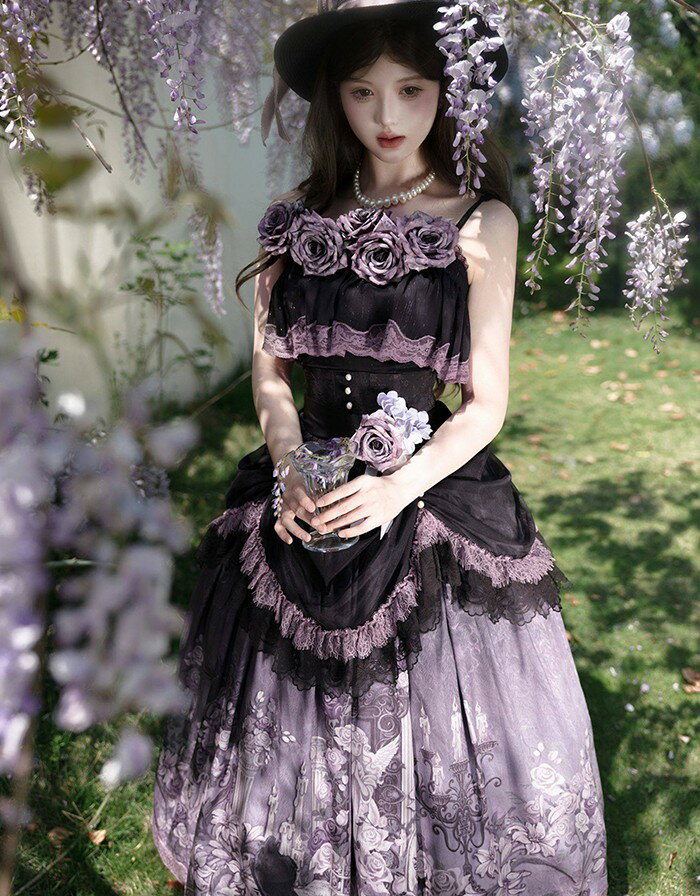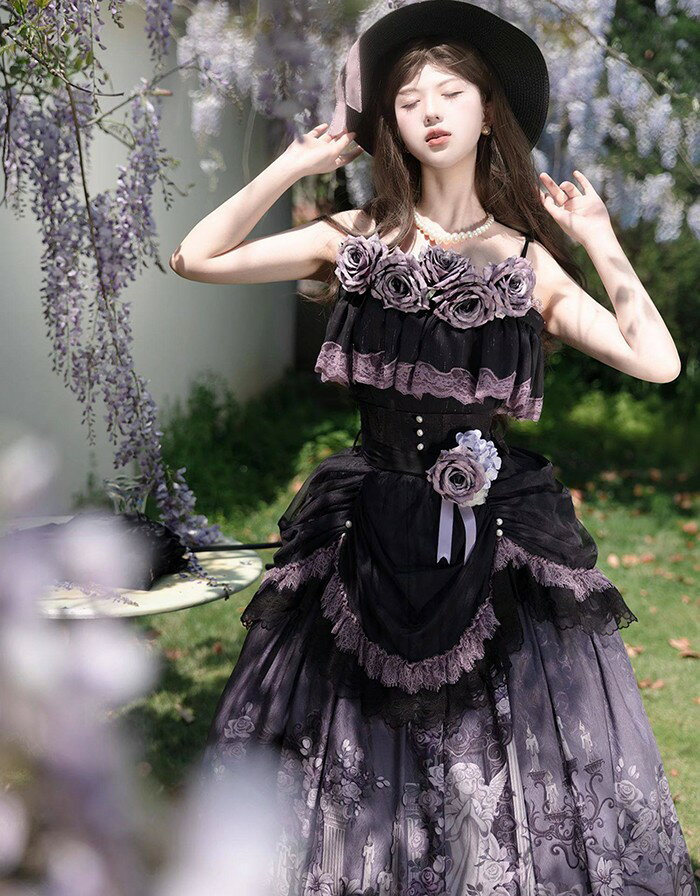 ロリータ スカート トップス セット JSK ブラック×パープル レディース 夏 甘ロリ 可愛い 上品 上下セット コスチューム 仮装 イベント ダンス 卒業式 余興 学園祭 演劇 舞台 学芸会 文化祭 ハロウィン S M L nd009lclcm3
