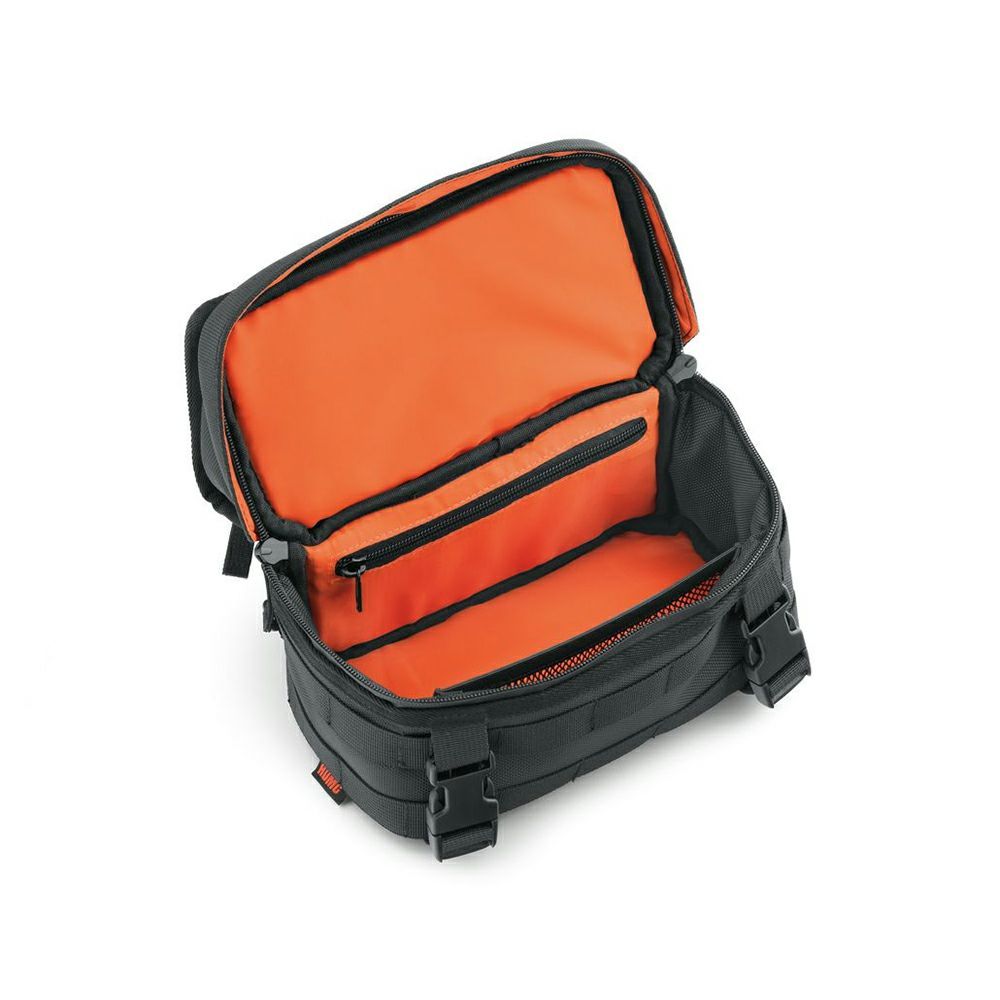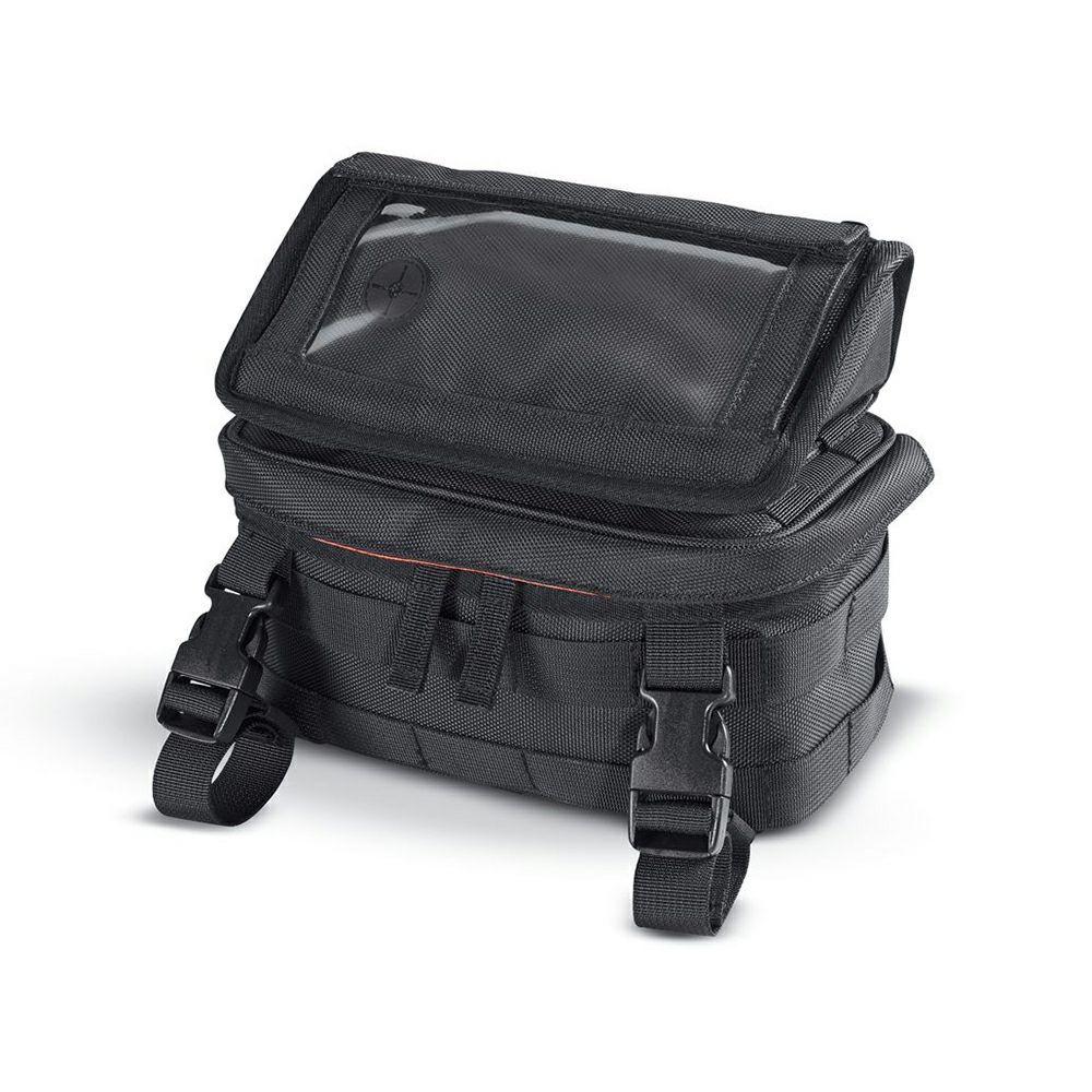 収納力、スタイル、使いやすさが抜群のオーバーウォッチ・ラージ・ハンドルバーバッグ。トップコンパートメントは取り外し可能。透明プラスチックポーチにスマートフォンやGPSを入れたまま、画面操作ができます。このポーチには、財布やキーを収納するのに便利なジッパー式コンパートメントも付いています。大型メインコンパートメントは、ジップポケット1個およびメッシュポケット1個が備わっています。調整可能なクイックリリース・バックルやモールスタイルのマウントシステムが採用されているため、取り付けも簡単です。フック&ループ式マルチフィット・マウントストラップ6個が同梱されています。寸法:幅114×奥行241×高さ178mm。容量:4L。標準装備および高さ2インチ以上のアクセサリーライザーに適合。XLモデルでトリプルクランプ一体型のライザーおよび4インチ径ライザーマウント・スピードメーター装着車には適合不可。