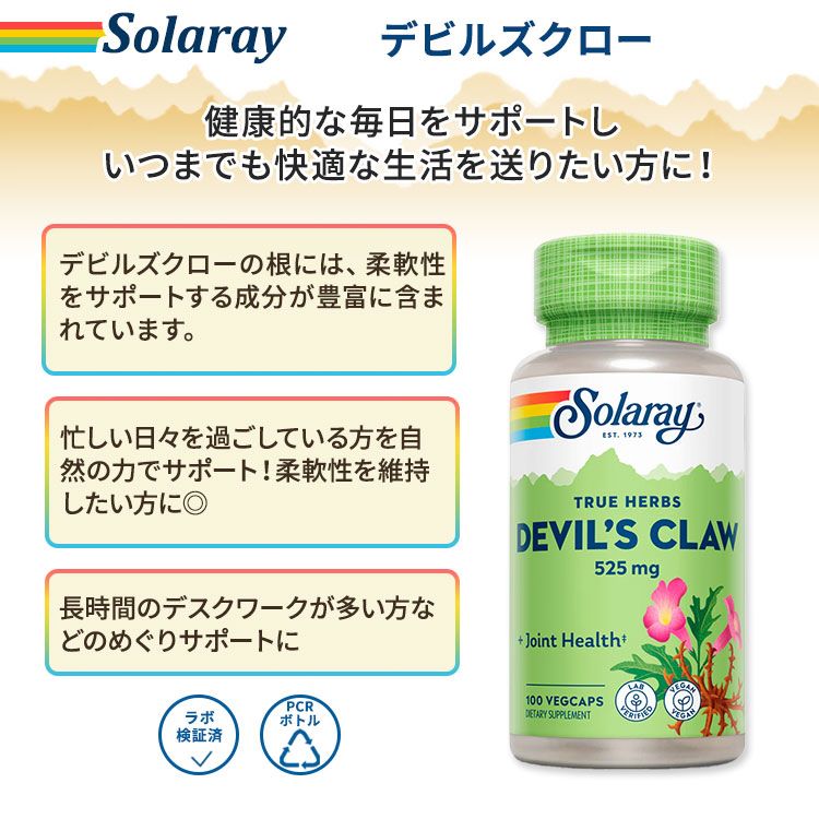 【今だけ半額】ソラレー デビルズ クロー 525mg 100粒 ベジカプセル Solaray Devil's Claw サプリメント 元気 快適 植物性 ハーブ 健康サプリメント 栄養補助食品 海外 アメリカ