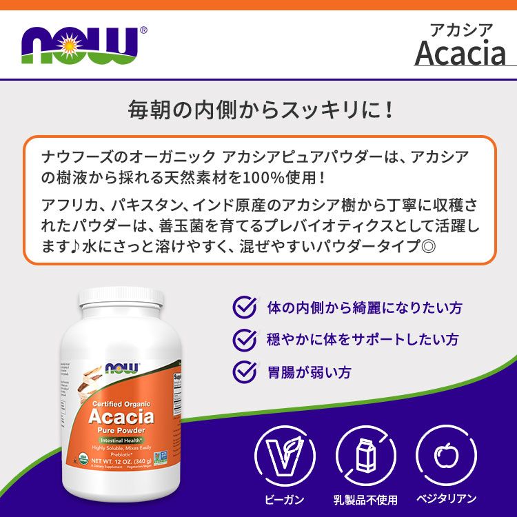 【店内8千円以上1000円OFFクーポン】ナウフーズ アカシア オーガニック パウダー 340g (12oz) NOW Foods Acacia Organic Powder サプリメント プレバイオティクス ピュア
