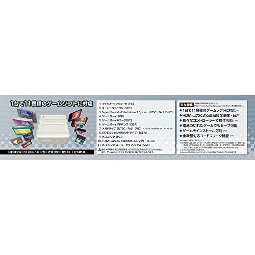 ◆商品名:サイバーガジェット レトロフリーク (レトロゲーム互換機) (コントローラーアダプターセット) 入力電圧:100-240V 1台で11機種のレトロゲームカートリッジに対応 9000以上のゲームが動作するレトロゲーム互換機 コントローラーアダプターで、各種レトロゲーム機の純正コントローラーも使用可能 【特長】 11機種9000タイトル以上のレトロゲームに対応 最新のテレビにも接続可能なHDMI出力 電池の切れたカセットでも本体にセーブ可能 ゲーム中どこでも好きな場所でセーブ可能 PS3/PS4などのUSBコントローラーを使用可能 コントローラーのボタン配置を自在に変更可能 画質や音質等のプレイ環境を細かく設定可能 カートリッジのゲームをインストール可能 ※1 全機種対応コードフリーク機能を搭載 ※1 ※2 ※1:別途microSD(別売)が必要 ※2:別途インターネットに接続できるパソコンが必要 ■互換機種:FC/SFC/SNES/GB/GBC/GBA/MD/GEN/PCE/TG-16/PCE SG ■セット内容:本体、カートリッジアダプター、コントローラー(ケーブル長約1.8m)、HDMIケーブル(約1m)、ACアダプター(PSE,CE規格)、コントローラーアダプター、USBケーブル(0.8m) ※ゲームソフトは付属しておりません