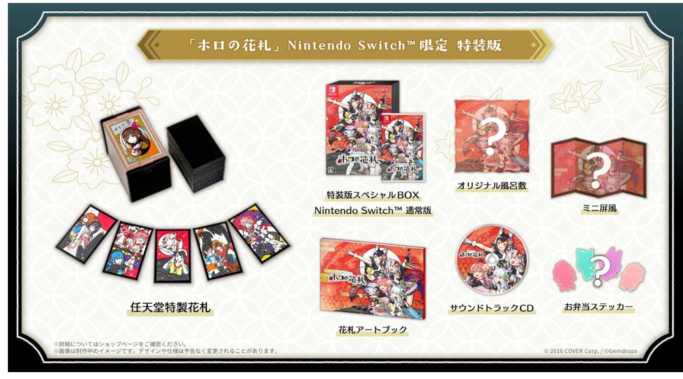 【新品・限定特典】ホロの花札 特装版 -Switch描きおろしイラストパッケージ入り 花札風メモ帳(8柄)同梱 4570045990131 ホロライブのメンバーが描かれた”オリジナル花札”で遊ぶアドベンチャーゲーム『ホロの花札』がNintendoSwitchに登場!【「ホロライブ」とは】「ホロライブ」は、ホロライブプロダクション傘下の女性VTuberグループです。YouTubeを中心としたライブ配信のほか、ゲーム大会の企画運営プロデュースや楽曲をリリースするアーティストまで、それぞれの個性を生かした活躍の場をバーチャルだけでなくリアルの領域まで広げています。【ストーリー概要】ひょんなことから彼女たちが紛れ込んだのは、花札に描かれた景色が広がる謎の世界。仲間と出会いながら花札勝負で敵に挑んで行きます。ホロライブのメンバーたちが活躍するオリジナルストーリーをお楽しみください。【ゲームシステム】本作では、花札本来のルール「こいこい」「おいちょかぶ」「花あわせ」の他に、ルール破壊の新ルール「ホロあわせ」を含む全4種類の花札ルールで遊ぶことができます。配られた札から役を作り、高得点を狙いましょう。 ●オリジナルルール「ホロあわせ」手持ち札と場の札から決められた役を作り、点数を競い合うのが花札の基本ルールですが、「ホロあわせ」では、札に描かれたタレントたちを揃えて発動する「ホロ役」が存在します。さらに、各タレントが持つ「タレントスキル」を組み合わせて相手よりも多くの得点を獲得することができます。●オンライン対応花札は通常、2人以上のプレイ人数が必要ですが、オフラインでCPUとも戦えますので、1人でも気軽に楽しんでいただけます。もちろん、オンラインプレイにも対応していますので、遠くのお友達や、ランダムマッチで知らない人とも対戦が可能です。●多彩なゲームモード基本の花札のほか、ホロライブのメンバーたちが花札をしながらストーリーが展開される「アドベンチャー」、メンバーと共に作る「手づくり弁当」などのやりこみモードも搭載。お弁当の具材は花札バトルでコインを集め、ショップで購入することができます。オンラインでほかのユーザーとお弁当を交換することも。あなただけのこだわりを詰めたお弁当を作ってみてくださいね。■特装版内容・ホロの花札 for Nintendo Switch パッケージ版・任天堂特製 ホロライブ花札・オリジナル風呂敷・ミニ屏風・サウンドトラックCD・花札アートブック・お弁当ステッカープレイ人数:オフライン時 1人ローカル通信時 1~4人インターネットオンライン時 1~4人対応言語(テキスト):日本語/英語/中国語(繁体字・簡体字)/韓国語/フランス語/イタリア語/ドイツ語/スペイン語/ポルトガル語/オランダ語/インドネシア語 繁忙期を除き1~5営業日以内に発送致します。3