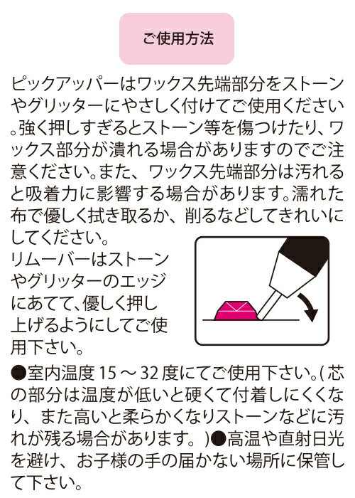 ストーンやスパンコールなど細かいパーツをらくらくキャッチ&リムーブ ●作業効率UP!便利な2WAYツール ●細かなパーツを簡単キャッチ ●芯先交換可能 ●リムーブもかんたん便利 <内容> 内容量:3ヶ入り 材質:ワックス・ステンレス 単品サイズ:W70×H100×D22mm 単品重量:9g MADE IN CHINAストーンやスパンコールなど細かいパーツをらくらくキャッチ&リムーブ ●作業効率UP!便利な2WAYツール ●細かなパーツを簡単キャッチ ●芯先交換可能 ●リムーブもかんたん便利 <内容> 内容量:3ヶ入り 材質:ワックス・ステンレス 単品サイズ:W70×H100×D22mm 単品重量:9g MADE IN CHINA