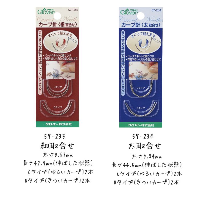 まっすぐな針では縫いにくいところをすくって縫えます。 バッグやキルトの飾りつけ、布箱やぬいぐるみの縫い合わせに。 Cタイプ(ゆるいカーブ)2本、Uタイプ(きついカーブ)2本。 〇カーブ針 細取合せ 57-233 太さ0.53mm 長さ42.9mm(伸ばした状態) Cタイプ(ゆるいカーブ)2本 Uタイプ(きついカーブ)2本 〇カーブ針 太取合せ 57-234 太さ0.84mm 長さ44.5mm(伸ばした状態) Cタイプ(ゆるいカーブ)2本 Uタイプ(きついカーブ)2本 こちらは取り寄せ商品でございます。通常2-3営業日で発送いたします。 ポスト投函されますのでポストのご確認をお願いいたします。 ※ご注文商品の変更・キャンセル、お客様都合の返品はご容赦いただいております。