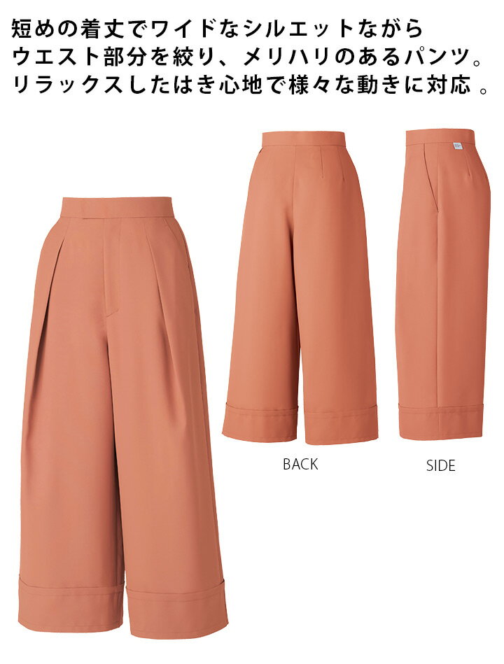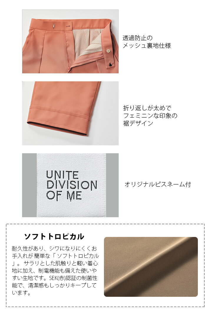 UNITE DIVISION OF ME パンツ(女) DOM-0005 短めの着丈でワイドなシルエットながらウエスト部分を絞り、メリハリのあるパンツ。 リラックスしたはき心地で様々な動きに対応。◆素材:ソフトトロピカル(ポリエステル100%) ◆機能:透防止、制電、制菌 ◆仕様:前ファスナーあき、メッシュ裏地付き、両脇ポケット関連商品はこちら ファスナースクラブ (女) ファスナースクラブ (女) パンツ(女) ⇒あなただけの1着に!刺繍はこちらから