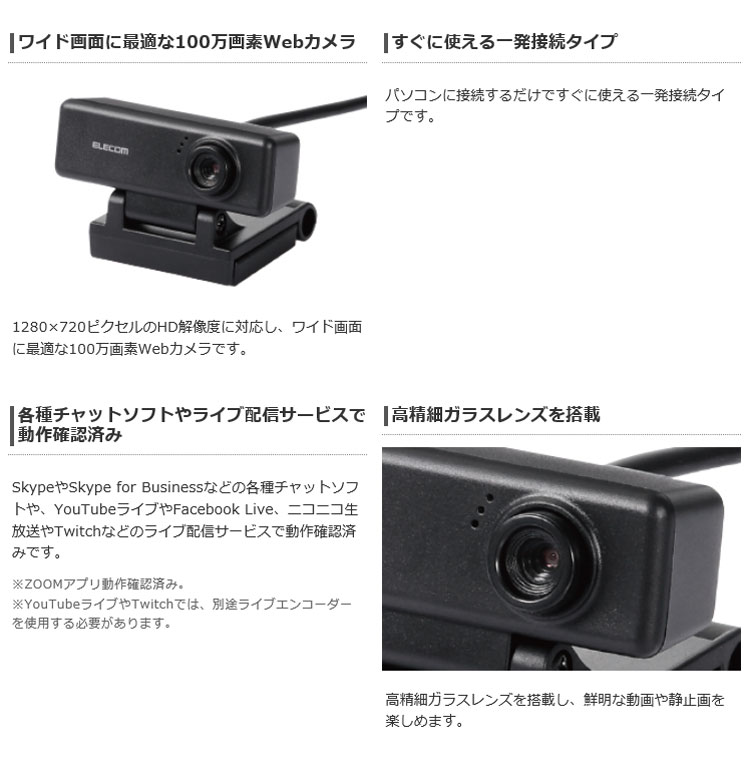 商品名 高画質HD対応200万画素Webカメラ ケーブル長 1.5m 品番 UCAM-C520FBBK 仕様 特長:すみずみまで美しく、キレイな映像でビデオチャットを楽しめる高画質200万画素Webカメラ。 ●1600x1200ピクセルの高解像度に対応。 ●パソコンに接続するだけですぐに使える一発接続タイプ。 ●各種チャットソフトやライブ配信サービスで動作確認済み。 ●高精細ガラスレンズを搭載し、鮮明な動画や静止画を楽しめます。 ●動画だけでなく、800万画素の静止画を撮影して送信することも可能です。 ●カメラ本体に内蔵マイクを搭載しているので、複数人で会話をすることも可能です。 ●ノートパソコンやデスクトップパソコンのディスプレイに取付可能で、平面にも設置可能なマルチスタンドを採用。 ●カメラ本体は上下に角度を調整可能です。 ●無料ダウンロードできる「WebCamアシスタント」をインストールすることで、YouTube投稿機能、動画の簡易編集機能などの便利な機能を使用可能です。 ●多国語マニュアルが付属しています。 ●商品サイズ:60.0x52.3x39.0 (mm) ※ケーブルを含まず メーカー名 エレコム