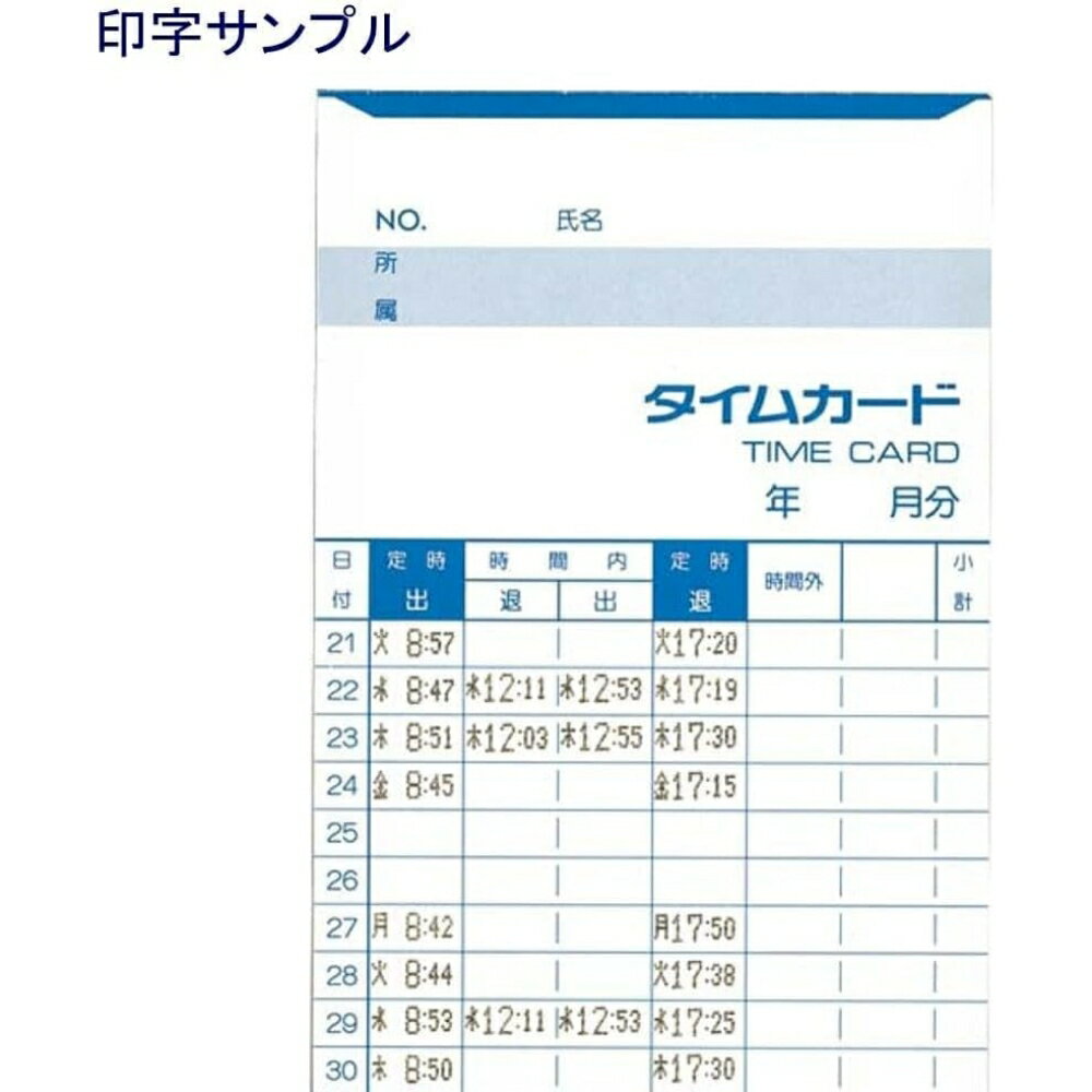 特長:シンプル機能にこだわったタイムレコーダー。少人数のオフィスやお店に最適。 ●安心・高品質の日本製 ●外出/休憩も記録できる4欄印字。 ●コンセントに差し込むだけですぐ使える。 ●タイムカードを自動引込み・自動印字。 ●見やすい大型アナログ時計。 ●打刻時刻を大きくはっきり印字。 ●打ち間違えなしの表裏判定機能付き。 ●停電時にもリチウム電池により内部時計は歩進します。 ●停電からの復帰でアナログ時計を内部時計にあわせます。 ●コンパクト、据え置きも壁掛けも可能。 ●時計方式:水晶発振方式 週差±3秒以内(25℃±5℃) ●カレンダー方式:万年カレンダー(月末自動調整)内蔵 ●メモリー保持(停電補償):工場出荷時より停電累計時間で3年間/リチウム電池内蔵 ●印字方式:カード自動引込式/ドットプリンター方式 ●印字色:単色(黒) ●印字欄:4欄 ●集計機能:なし ●外部時報出力:なし ●電子メロディ内蔵:なし ●電源:AC100V(50/60Hz) ●消費電力:待機時2W、定格8W ●使用環境条件:温度-10℃~40℃、湿度10%~90%RH(結露なきこと) ●外形寸法:190W×104D×224H(mm) ●質量:2.3kg ●設置方式:据え置き式(壁掛け可能) ●保証期間:3年間(タイムレコーダー本体のみ)