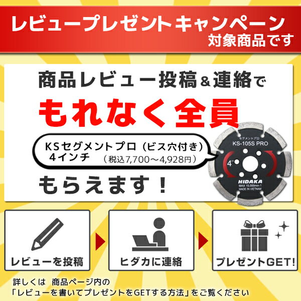 仕様 ・ スペック 湿乾タイプ 乾式 (湿式での使用も可能) タイプ(ビス穴付き:PCS35×3W) セグメントタイプ 外径 105mm (4インチ) 刃厚 2.2mm 内径 20mm ※2020年11月 板面デザインをリニューアルしました。(性能は変わりません。) 使用可能機種 HiKOKI(旧日立工機):電動ディスクグラインダー(105mm)マキタ:電動ディスクグラインダー(105mm)リョービ:電動ディスクグラインダー(105mm)その他各メーカー 100mmディスクグラインダー※湿式でご使用の場合、取り付け機種が湿式に対応していない場合には機械の故障等の恐れもある為、お使いの機械の使用法をご確認下さい。 ●KSセグメントプロ取付専用フランジ 10ミリネジ用はこちら ●KSセグメントプロ取付専用フランジ 16ミリネジ用はこちら Q. 領収書はもらえますか? 領収書の宛名を会社名で発行してもらえますか? Q. 見積書・請求書は発行できますか? …… A.はい、発行可能です。詳細は下記をクリックしてごらんください。 …… << 領収書の発行について >> << 見積書・請求書の発行について >>