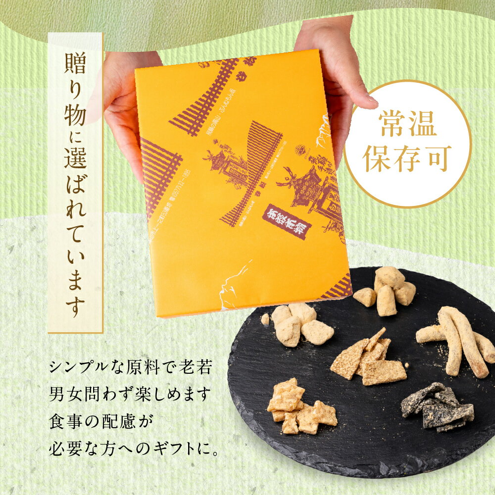 飛騨高山の伝統のお菓子"こくせん" 明治25年からこだわって作っている谷松のこくせんは、 地元にも観光客にも、『こくせんは谷松でないと』というお客様も多い、 知る人ぞ知る本当に美味しいお菓子です。 そんな本当に美味しいお菓子を、 3種類食べ比べられるセットです。 化粧箱入りなので、大切なシーンのギフトにもお使いいただけます。 是非、大切なあの人に、大切なシーンでお使いください。 黒胡麻こくせん、白胡麻こくせん、落花の舞、げんこつ、黒胡麻げんこつ、かんかん棒の6種類が入った贈答用ギフトセットになります。 素材にこだわった、絶妙な甘さでどんな方にも喜ばれる上品なおいしさです。 商品説明文 名称 谷松バラエティギフト(黒胡麻こくせん90g×1、白胡麻こくせん90g×1、落花の舞90g×1、げんこつプレーン210g×1 げんこつ胡麻210g×1 かんかん棒110g×1) 原材料 白胡麻こくせん:白胡麻(国内製造)、水飴、砂糖、大豆粉 黒胡麻こくせん:黒胡麻(国内製造)、水飴、砂糖、大豆粉 落花の舞:落花生(米国産)、水飴、砂糖、大豆粉 賞味期限 約1か月直射日光、高温保湿を避けて冷暗所で保存してください。 配送方法 常温にてお届け致します。
