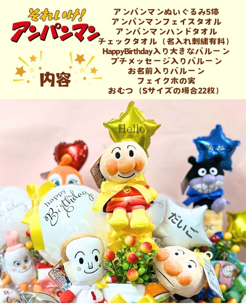 出産祝い 名入れ 刺繍 おむつケーキ 豪華5体盛りアンパンマン 3段 出産祝い 送料無料 端午の節句 ぬいぐるみ バイキンマン ドキンちゃん 名前入れ 刺繍 男の子 女の子 クリスマス 【月間優良取得店舗 】おむつケーキ 出産祝い オムツケーキ 【名前入れ 名入れ】ビタミンカラーで元気いっぱいアンパンマンのおむつケーキ アンパンマンのプリちぃ★ビーンズ ぬいぐるみのおむつケーキです。 内容アンパンマンのぬいぐるみ・・・5個アンパンマンフェイスタオル・・・1枚アンパンマンハンドタオル・・・1枚チェックタオル(名入れ刺繡+500円)・・・1枚HappyBirthdayの大きなバルーンプチメッセージ入りバルーンお名前入りバルーンフェイク木の実※選択肢にてご選択いただいた通りに製作をさせていただきます。例:選択肢にて【ひらがな明朝体】をご選択いただき、お名前入力欄にローマ字(Tarou)とご記入いただいた場合、選択肢にてご選択いただいた字体【ひらがな明朝体】【たろう】と刺繍及び印字いたします。 2