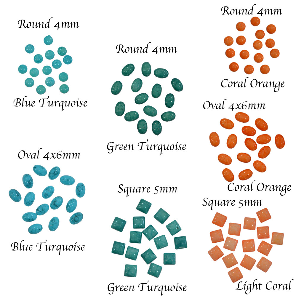 夏に人気のターコイズ&コーラルカラーのアクリルストーンです。 1・ブルーターコイズ ラウンド4mm / 15pt 2・コーラルオレンジ ラウンド4mm / 15pt 3・ブルーターコイズ オーバル4x6mm / 15pt 4・グリーンターコイズ オーバル4x6mm / 15pt 5・コーラルオレンジ オーバル4x6mm / 15pt 6・グリーンターコイズ スクエア5mm / 15pt 7・ライトコーラル スクエア5mm / 15pt 以上7種類より選んでください。 ※アクリルストーン特性である製造時に生じるバリ欠けやバリ残りのある商品があります。 1ミリ以上の欠けやバリ残りは検品にて除去しております。