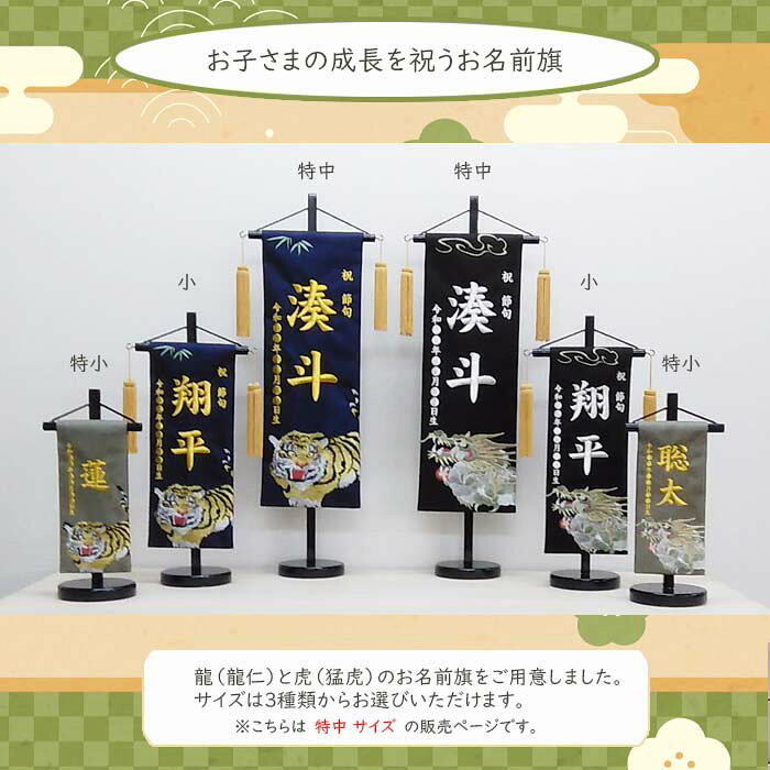 五月人形の脇飾りや、お誕生祝いに大人気! 男の子用名前旗、縁起の良い吉祥紗綾形生地に刺繍でお子様のお名前、生年月日を入れてお届けします。 黒生地の旗に、銀糸刺繍でおつくりいたします。 ■飾りつけ寸法■ 高さ57cm(台含む) 旗に刺繍するお名前(下のお名前のみ)、生年月日(和暦)を、ご注文確認画面の「※備考」欄にご入力ください。 のし、ラッピング(簡易包装)を無料でいたします。ラッピング指定で「包装紙(シンプル)」をお選びいただきましたら、節句祝い用の包装紙をおかけして発送させていただきます。 ※こちらの商品はご注文後にオーダーにて作成いたしますので、キャンセルが出来ません。ご注意くださいませ。 ※お届けまで目安はご注文またはご入金確認日から約10日〜14日ほどとなります。招福名前旗「龍仁 特中サイズ」 お名前と生年月日は刺繍でお入れいたします 「お名前、生年月日入れ代」も価格に含んでおります
