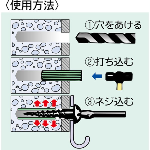 ・木ねじがコンクリート、ブロックの壁面に使えます。・割れません。・抜けません。・腐りません。・コンクリート、ブロックの壁面に。・呼び径(mm):10・長さ(mm):50・穿孔深さ(mm):53・引張最大荷重(kN)コンクリート:7.84・引張最大荷重(kN)ALC:1.29・下穴径(mm):10・下穴径(mm)コンクリート:10・下穴径(mm)ALC:10・使用ビス径(mm):6.2 6.8・色:ブラックブルー・適合ねじ:木ねじ、タッピングねじ・ナイロン・簡易ポンチ・ポンチなどで必ず3mm奥へ打ち込んでください。・穴の中の切粉は取り除いてください。・生産国 日本・JANコード 4992456030181・質量 275g・コード:115-1106 ・品目:105010-50楽天 HD店