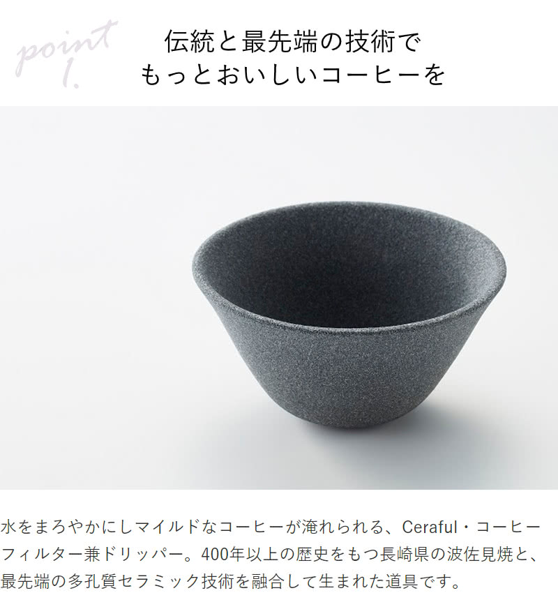 いつものコーヒーを豊かなものにCerafulスタンドセット 1〜3杯分水をまろやかにしマイルドなコーヒーが淹れられる、Ceraful・コーヒーフィルター兼ドリッパー。400年以上の歴史をもつ長崎県の波佐見焼と、最先端の多孔質セラミック技術を融合して生まれた道具です。Cerafulは通した水の残留塩素と不純物を除去。遠赤外線効果で水をまろやかに整えます。さらに多孔質構造でコーヒーのアロマオイルを抽出。香りも愉しめる仕上がりに。緑茶や紅茶、お酒類にもおすすめです。淹れられるコーヒーの量の目安は1〜3杯。1人分から気軽に使えるので、朝食から夕食後まで活躍します。フィルターを兼ねているCerafulにペーパーフィルターは不要です。用意する手間が省けるのはもちろん、お財布と環境に優しいのも嬉しいポイント。淹れた後はコーヒーの粉を取り、水洗いするだけ。透明な水が通るようになったらお手入れは完了です。詰まりやニオイが気になった時は煮沸を。Cerafulはカップやサーバーにのせて淹れることもできますが、スタンドがあるとより使いやすくなります。華奢なゴールドのスタンドは、片付けずにそのまま置いていても様になります。スタンドセットはロゴがプリントされたボックス入り。コーヒー好きの家族や友人へのプレゼントにもおすすめです。Ceraful(セラフル)シリーズにはフィルター&ドリッパーのサイズ違いと専用スタンド、セット商品などもご用意しています。使うシーンに合わせてお選びください。SIZESERIESフィルター&ドリッパー1〜3杯用専用スタンド1〜3杯用スタンドセット1〜3杯用フィルター&ドリッパー3〜5杯用専用スタンド3〜5杯用スタンドセット3〜5杯用SPECサイズ〔セラフル〕約 直径11.5×高さ6(cm)重量:約107g〔スタンド〕約 直径11.3×高さ16.5(cm)重量:約112g内容量セラフル、スタンド 各1個材質セラフル:アルミナスタンド:18-8ステンレス(ゴールドメッキ)生産国日本製仕様詳細食洗機不可備考※商品ページ内には別の商品を含む画像を使用しています。※重量は商品によって個体差があるため多少の誤差があります。※お客様のお使いのモニター設定、お部屋の照明等により色味が実際と異なる場合があります。キャンセル・返品区分小型商品CAMPAIGN関連キーワード: コーヒー ドリッパー 一人用 フィルター不要 波佐見焼 ハンドドリップ 珈琲 1人用 2人用 3人用 1杯分 2杯分 3杯分 シンプル コーヒー用品 使いやすい おすすめ 道具 キッチン雑貨 プレゼント ギフト 誕生日 父の日 母の日 敬老の日 バレンタイン ホワイトデー 父 母 祖父 祖母 友人 同僚 贈り物 キッチン用品 生活雑貨 HT217