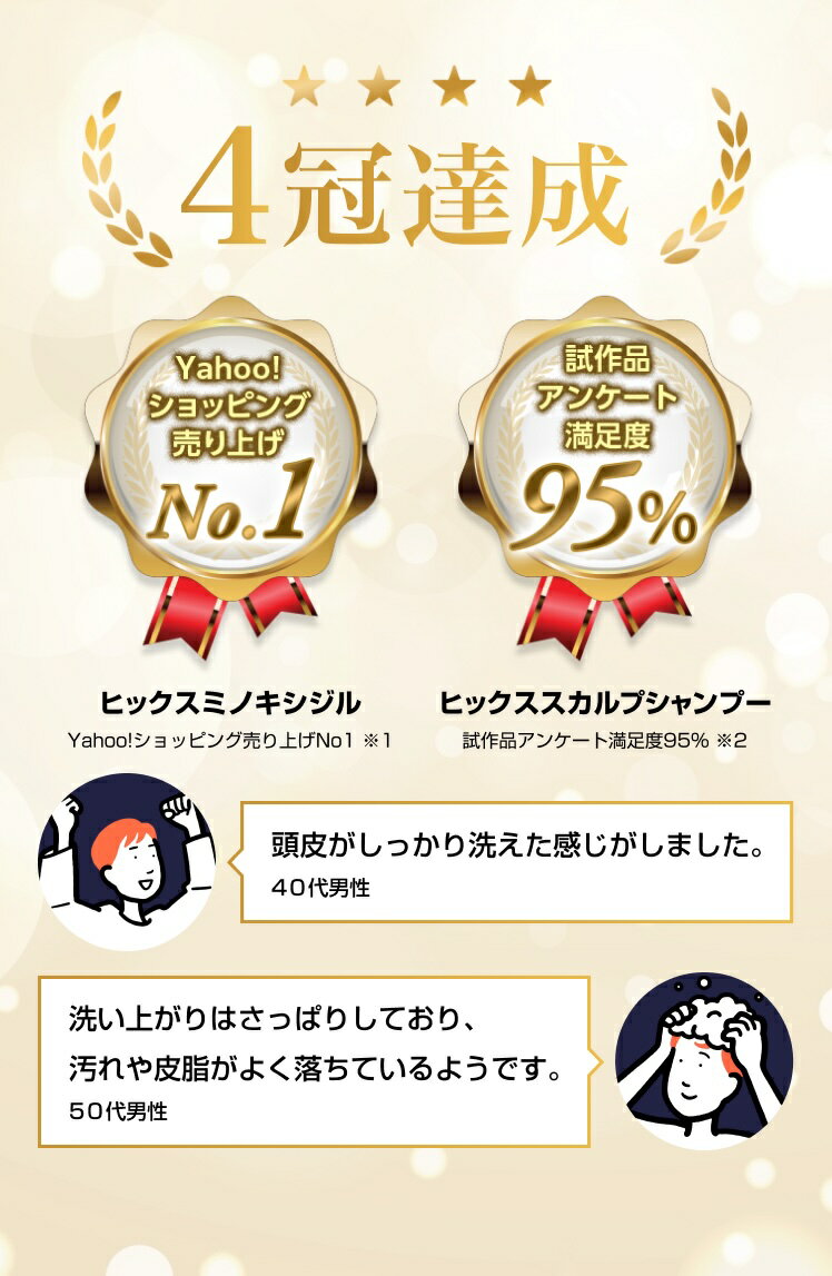 おトクなスカルプセット! ◆5万人のデータからAGA管理アプリ開発会社が本気でつくった!高浸透スカルプシャンプー! ◆インナーケアでハリコシある毎日を!食事から摂りにくい栄養がこれ1つで ◆ヒックス 高浸透スカルプシャンプー 国内初「ヘアケアアプリ」に集まった男性5万人の髪と頭皮データを分析し、毛髪診断士と(株)サティス製薬がタッグを組み、日本人男性の毛髪と頭皮環境に最適な配合や成分を開発しました。 高密着泡が頭皮の汚れをていねいに洗いあげ、すこやかな髪や頭皮を保つために必要な成分を浸透させることで、髪にハリやコシを与え、ふんわりボリューム感を出します。 5つの特徴 高密着泡で頭皮の奥の角質層まで浸透 メディカルプロテクション処方 髪にはり、こしを与え、頭皮、毛髪をすこやかに保つ成分をたっぷり配合 アデノシン アカヤジオウ根エキス オクトピロックス 頭皮環境を整える天然由来成分等を配合 ポリクオタニウム-48の配合で髪を乾かした後のふんわり感を実現 頭皮に優しいアミノ酸系シャンプー 石油系界面活性剤や合成着色料などの刺激性成分は使用しておりません。 ◆ヒックス サプリメント 3つの特徴 カラダの内側へ本当に必要な3つの成分を配合 L-リジン:タンパク質の元となる必須アミノ酸 ビオチン:タンパク質の生成を促進 亜鉛:タンパク質生成を助ける GMPに適合した国内工場で製造された高い品質保証 続けやすい価格 1日量4粒あたりの主要原材料 L-リジン塩酸塩:500mg ビオチン:250μg 亜鉛:8mg ビタミンC:264mg ビタミンB1:2mg ビタミンB2:2.5mg ビタミンB3:15.8mg ビタミンB6:3.36mg ビタミンB12:5.28mg 葉酸:0.2mg 賦形剤 注意事項 お身体に異常を感じた場合は、飲用を中止してください。 薬を服用中あるいは通院中の方、妊娠中の方は、お医者様にご相談の上お召し上がりください。 直射日光、高温多湿な場所をさけて保存してください。 お子様の手の届かないところで保管してください。 開封後はしっかり開封口を閉め、なるべく早くお召し上がりください。 食生活は、主食、主菜、副菜を基本に、食事のバランスを。