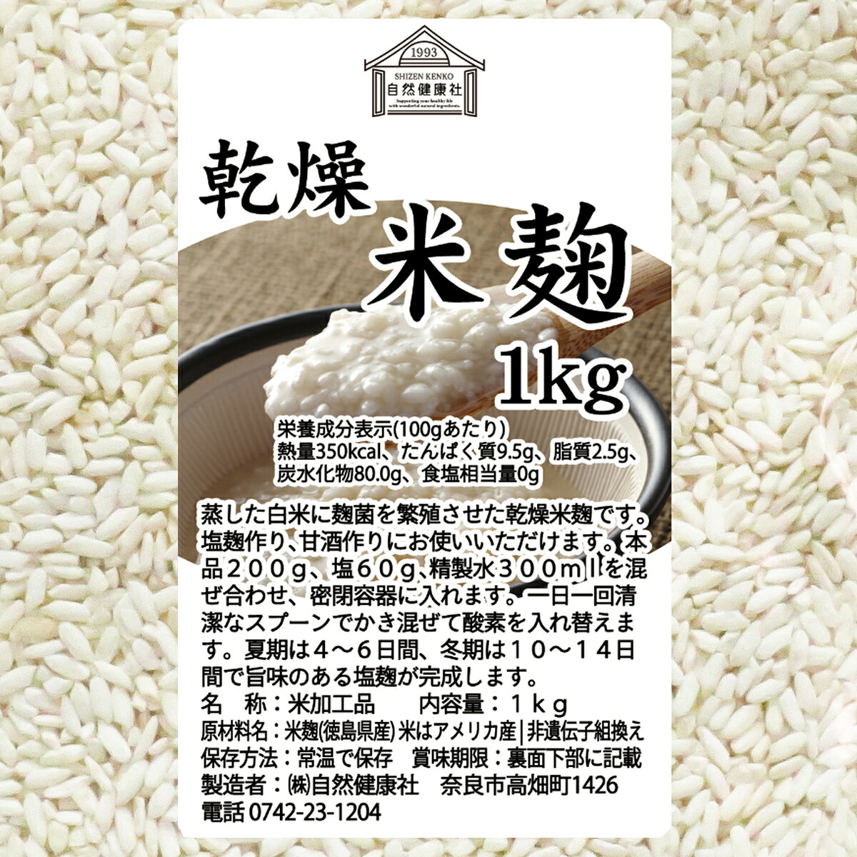 米麹について 米こうじは蒸したお米に麹菌(こうじ菌)を種付けし、酵素の力で繁殖、発酵させたものです。 ビタミンB1、B2、B6、B12、葉酸、パントテン酸、イノシトール、ビオチン、食物繊維、オリゴ糖、システイン、グルタミン酸、必須アミノ酸、ブドウ糖、乳酸菌など豊富な栄養を含みます。 乾燥米糀から作る塩麹や麹味噌(こうじみそ)、麹漬けも料理の幅が広がる人気の発酵食品です。 同じく米麹を発酵させて作るノンアルコールの手作り甘酒は飲む点滴、飲む美容液と呼ばれ、健康・美容を心がける方のサプリメントとして人気です。 また麹水、糀水やお菓子、製菓・製パン材料、化粧水・化粧品にも利用が広がり、昨今では無農薬米から作る米麹も登場し、人気を得ています。 商品について 日本国内でていねいに作られた乾燥米麹。無塩かつ保存料無添加で米麹100%で製品にしました。 水、塩を加えて保管するだけで自家製の塩麹を作ることができます。 甘酒作りにも適しており、自家製のおいしい甘酒になります。 麹水、糀水、発酵あんこにもお使いいただけます。 通常の密閉容器でもお使いいただけますが市販の発酵器やヨーグルトメーカーの温度管理をおすすめします。炊飯器、魔法瓶でも代用は可能です。 当社でも売れ筋ランキングに入る人気の乾燥米麹をお試しください。 保存に便利なチャック付き袋入り。大容量でお得な本品を業務用にもおためしください。楽天市場の冬ギフトや贈り物、御歳暮、お歳暮、クリスマス、冬の贈り物、お年賀、新年のご挨拶、寒中お見舞いにもおすすめ。 使い方 塩麹の作り方:本品200g、塩60g、精製水300mlを混ぜ合わせ、密閉容器に入れます。一日一回清潔なスプーンでかき混ぜて酸素を入れ替えます。夏期であれば4〜6日間、冬期は10〜14日間で旨味のある塩麹が完成します。 麹水の作り方:本品10〜20gを100mlの水に入れると糀水になります。酵素ドリンクとしてお飲みください。 菜食主義(ヴィーガン、ビーガン、ベジタリアン)のためのパワーフード、スローフードにもおすすめ。 高齢者の方向けの介護食、ソフト食、療養食のレシピに。 こども、幼児や妊娠中、授乳中の方でも安心してお召し上がりください。 名称 米加工品 原材料名 米麹(徳島県産|米はアメリカ産|遺伝子組み換えでない) 内容量 1kg×4個(約20回分 ※一回200gを使用した場合) 賞味期限 別途商品ラベルに記載 ※製造日から1年 保存方法 直射日光を避け、常温で保存してください 加工者 株式会社 自然健康社奈良県奈良市高畑町1426 添加物 なし(香料、保存料を使用していません) 栄養成分(100gあたり) 熱量350kcal、たんぱく質9.5g、脂質2.5g、炭水化物80.0g、食塩相当量0g 広告文責 健康生活研究所 0742-24-8380 区分 食品 生産:日本 乾燥米麹1kg×4個(送料別)はこちら 乾燥米麹1kg×5個(送料別)はこちら 乾燥米麹1kg×5個(送料無料)はこちら蒸した白米の表面に麹菌を増殖させた乾燥米麹です。 水、塩を加えて保管するだけで自家製の塩麹に。また自家製のおいしい甘酒ができます。 麹水にもお使いください。 保存に便利なチャック付き袋入りです。 ■ 乾燥米麹1kg×4個 米麹について 米こうじは蒸したお米に麹菌(こうじ菌)を種付けし、酵素の力で繁殖、発酵させたものです。 ビタミンB1、B2、B6、B12、葉酸、パントテン酸、イノシトール、ビオチン、食物繊維、オリゴ糖、システイン、グルタミン酸、必須アミノ酸、ブドウ糖、乳酸菌など豊富な栄養を含みます。 乾燥米糀から作る塩麹や麹味噌(こうじみそ)、麹漬けも料理の幅が広がる人気の発酵食品です。 同じく米麹を発酵させて作るノンアルコールの手作り甘酒は飲む点滴、飲む美容液と呼ばれ、健康・美容を心がける方のサプリメントとして人気です。 また麹水、糀水やお菓子、製菓・製パン材料、化粧水・化粧品にも利用が広がり、昨今では無農薬米から作る米麹も登場し、人気を得ています。 商品説明 日本国内でていねいに作られた乾燥米麹。無塩かつ保存料無添加で米麹100%で製品にしました。 水、塩を加えて保管するだけで自家製の塩麹を作ることができます。 甘酒作りにも適しており、自家製のおいしい甘酒になります。 麹水、糀水、発酵あんこにもお使いいただけます。 通常の密閉容器でもお使いいただけますが市販の発酵器やヨーグルトメーカーの温度管理をおすすめします。炊飯器、魔法瓶でも代用は可能です。 当社でも売れ筋ランキングに入る人気の乾燥米麹をお試しください。 保存に便利なチャック付き袋入り。大容量でお得な本品を業務用にもおためしください。楽天市場の冬ギフトや贈り物、御歳暮、お歳暮、クリスマス、冬の贈り物、お年賀、新年のご挨拶、寒中お見舞いにもおすすめ。 使い方 塩麹の作り方:本品200g、塩60g、精製水300mlを混ぜ合わせ、密閉容器に入れます。一日一回清潔なスプーンでかき混ぜて酸素を入れ替えます。夏期であれば4〜6日間、冬期は10〜14日間で旨味のある塩麹が完成します。 麹水の作り方:本品10〜20gを100mlの