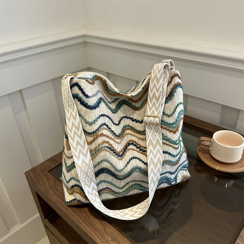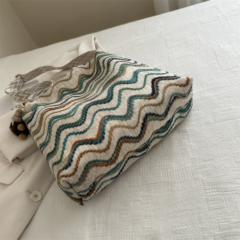 カラーストライプ編みバッグ ベルベットトートバッグ 大容量 シンプル ファッション ショルダーバッグ 通勤バッグ ショルダーバッグ