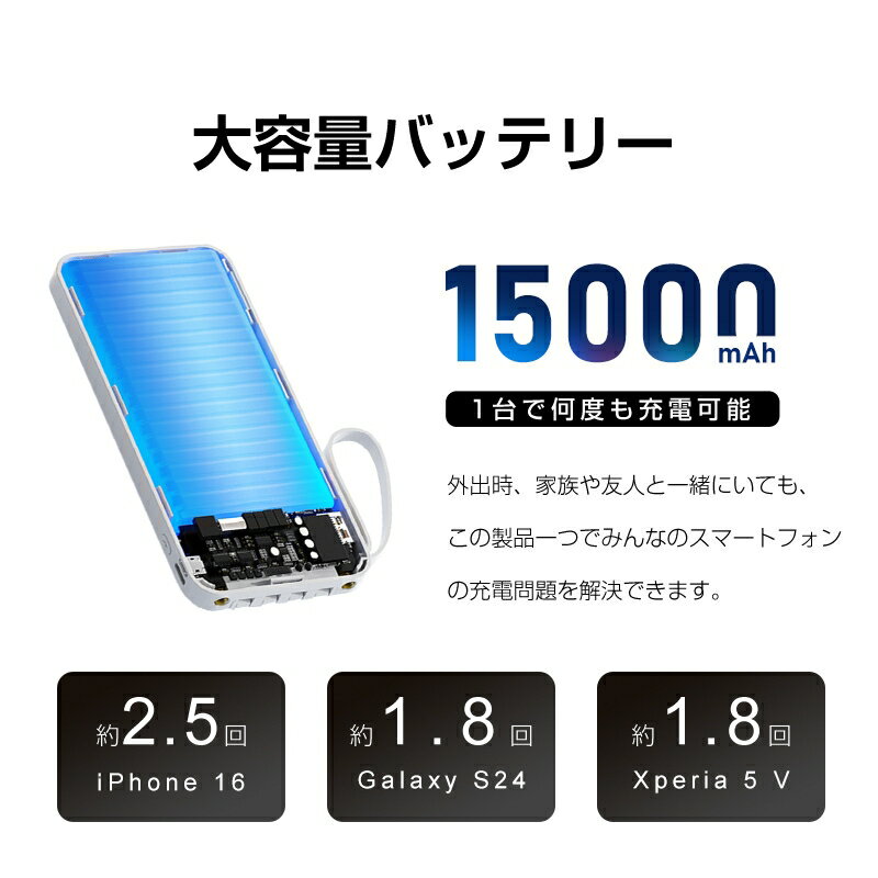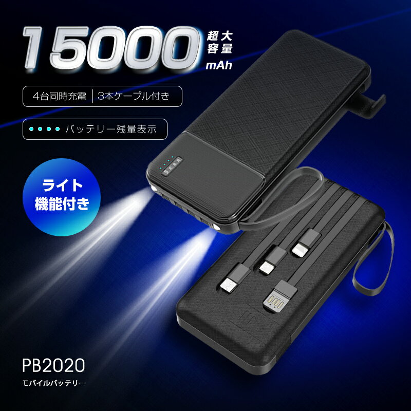 【期間限定1,580円→1,299円】 モバイルバッテリー 15000mAh 55.5Wh 大容量 軽量 防災電源 懐中電灯型 3つ入力 4つ出力 着脱式ケーブル 4台同時充電 引き出し式 スタンド付き パワーバンク iPhone17充電 急速充電 コンパクト PSE認証 送料無料 【PL保険加入済み安心】