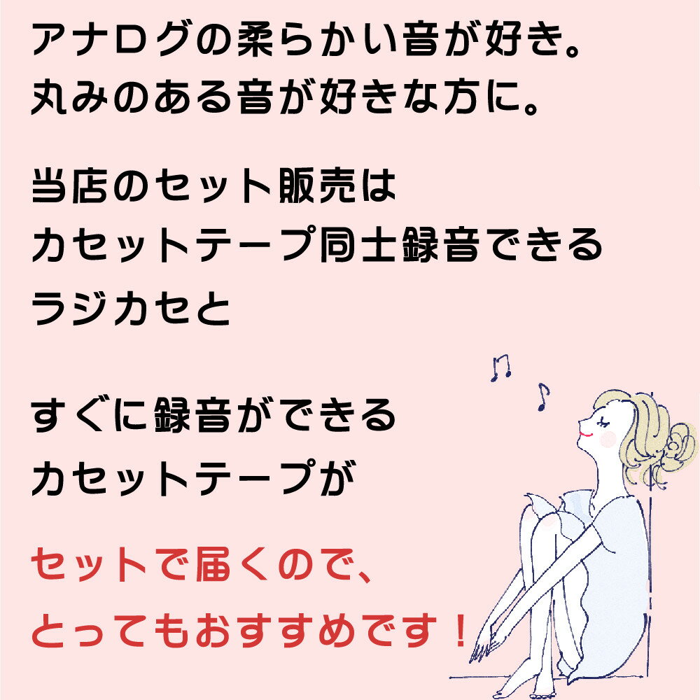 セット内容 1)東芝 CDラジカセ TY-CDW991(S) シルバー 【メーカー保証】1年間 【付属品】電源コード、リモコン、リモコンホルダー、デュエット用ジャック、取扱説明書(保証書付) 2)カセットテープ マクセル UR-60N5P 60分×5本 カセット同士の録音が楽になる Wカセットラジオ カセットテープからカセットテープに高速でダビングできます。 カラオケ練習やお稽古に利用でき、ダブルカセットは本体上部に搭載。 楽々操作で、見やすい大きなボタンと動作が一目で分かるLEDランプを採用しています。 カラオケ練習に使える機能が充実 再生音源の歌声だけを小さくできる「ボーカルダウン」の機能を搭載しています。 さらに、マイクの音声にエコーをかけて、音程やリズムなどのズレを目立たなくする「マイクエコー」機能。 そのほか、自分が歌いやすい音程に、半音刻みで高低5段階に調節できる「キーコントロール機能」がついています。 速いテンポの曲や、ゆっくりとしたテンポの曲も歌いやすくなる、5%ずつ20%まで調節できる「テンポコントロール」もあわせてご利用いただけます。 リモコン付きで操作が楽々 リモコン付きで、手元で簡単に操作ができます。 サイドに収納できるホルダーがついているため、紛失する心配がありません。 音程やテンポを調節したいときに、簡単に切り替えが可能です。 ●カセットテープにかんたんに録音できる ・テープ → テープ ・CD → テープ ・ラジオ → テープ ・外部入力 → テープ ・マイク端子 → テープ に簡単に録音ができます。 ※ハイポジションテープ(TYPEII/CrO2)は再生のみ対応しており、録音ができません。 ●フルオートストップ機能搭載 カセットテープを最後まで聞き終える、 あるいは巻き戻しや早送りの操作を行いカセットテープの終端になると、自動的にボタン解除されます。 操作の手間を省きます。 ●レジューム機能で前回の続きを再生 「レジューム再生機能」で、前回停止した位置から続きを再生できます。再生位置を探す手間が省けます。 ●デュエットを楽しめるように、デュエット用ジャックを付属 マイク2本(別売)を接続すると、デュエットを楽しめます。 ※本機にはマイクは付属しておりません。 また、ダイナミックマイク(2極モノラルプラグ)のみ使用可能です。コンデンサーマイクはご使用いただけません。 ●便利なリモコン+リモコンホルダー付き リモコン付きで手元で簡単に操作ができます。リモコンホルダーつきで、リモコンの置き場所に困りません。 CDプレーヤー部チャンネル数 2チャンネルステレオ CDプレーヤー部サンプリング周波数 44.1kHz CDプレーヤー部メディア CD、CD-R/RW(CD-DAフォーマット/MP3オーディオファイルで記録された音楽ディスク) ラジオ部受信周波数 FM:76.0〜108.0MHz AM:531〜1,710kHz カセットテープレコーダー部トラック方式 4トラック、2チャンネル カセットテープレコーダー部録音方式 ACバイアス録音 カセットテープレコーダー部消去方式 マグネット消去 カセットテープレコーダー部早送り・巻き戻し時間 約2分(C60) カセットテープレコーダー部推奨テープ ノーマルカセットC60 共通部電源 AC100V 50/60Hz、DC9V、単2形乾電池×6本(別売) 共通部スピーカー φ8cmコーン型8Ω×2 共通部実用最大出力※1 3.0W+3.0W(JEITA) 共通部入出力端子(AUX) 外部入力/ヘッドホン出力:φ3.5mmステレオミニジャック マイク入力:φ3.5mmモノラルミニジャック 共通部消費電力 28W 共通部電池持続時間※1※2 TOSHIBA単2形アルカリ乾電池使用時 CD再生時:約10時間 ラジオ受信時:約12時間、テープ再生時:約9時間 共通部最大外形寸法 351(幅)×141(高さ)×203(奥行)mm(突起物含まず) 356.5(幅)×147(高さ)×229.5(奥行き)mm(突起物含む) 共通部質量 約2.6Kg(乾電池含まず) 約3.0kg(乾電池含む) 共通部付属品 電源コード、リモコン、リモコンホルダー、デュエット用ジャック、保証書付取扱説明書 インテリアになじむ かわいい コンパクトなCDラジカセをお探しの方におすすめなのはTY-CDW991(S) です。 ワイドエフエム対応で高品質 音質重視な方も楽しめるモデル。 マイク端子付き 外部入力 ボーカルダウン 録音対応で、 カラオケ練習にもご使用いただけます。