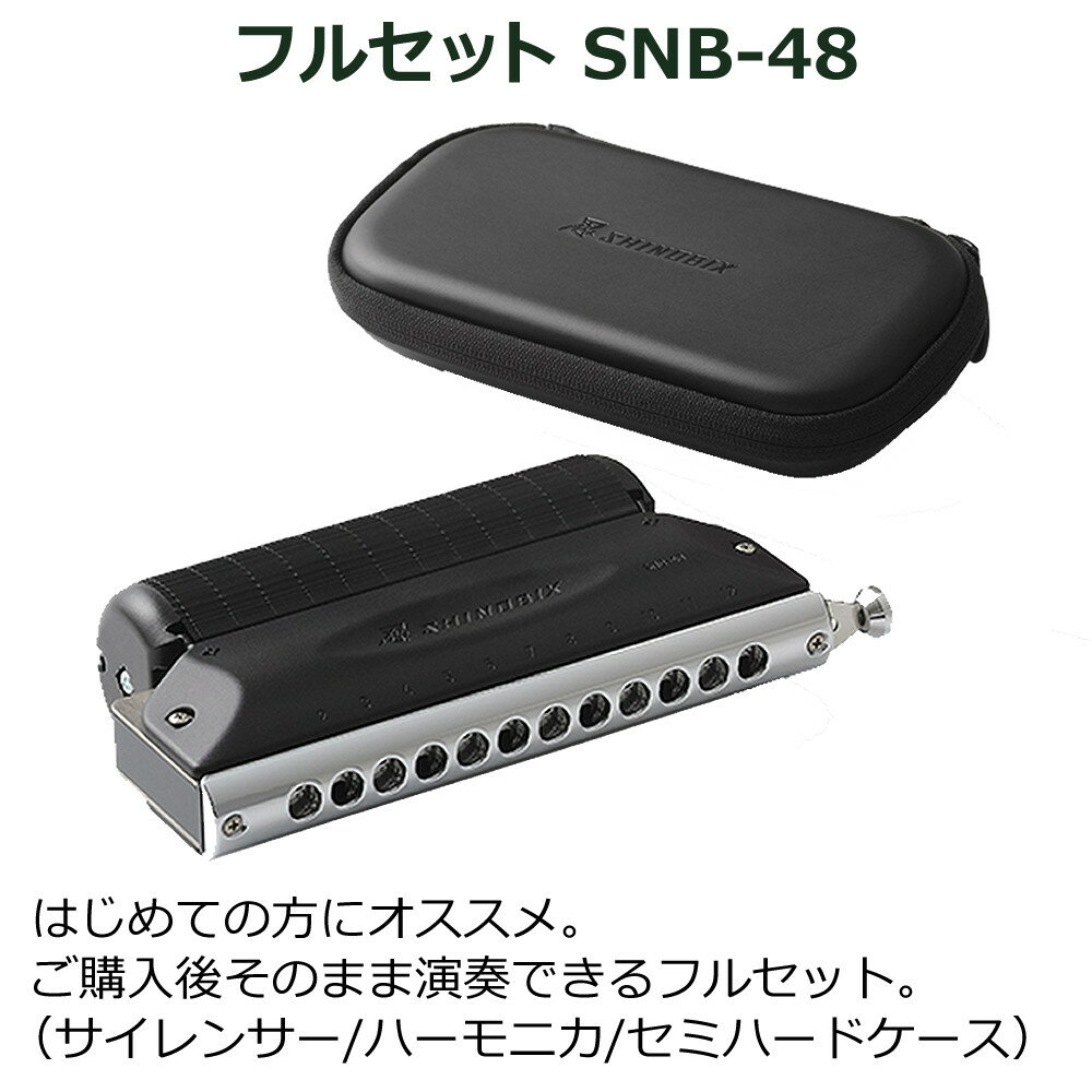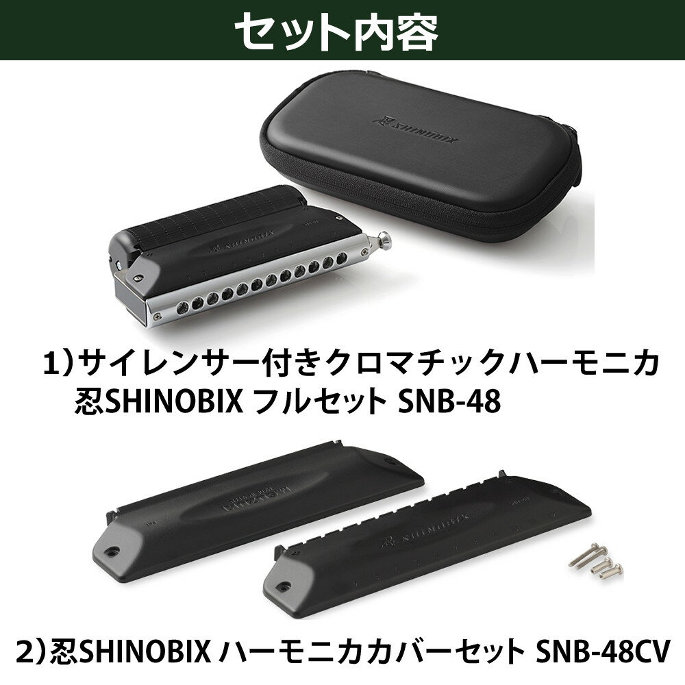 セット内容 1)忍SHINOBIX フルセット SNB-48 【付属品】セミハードケース 2)忍SHINOBIX ハーモニカカバー セット SNB-48CV 【付属品】上下ハーモニカカバー、カバー留めネジ×2 “いつもでも気軽に練習したい”“やってみたいけれど音量が…”そんな悩みをお持ちの皆様に。 ●概要 『忍SHINOBIX』はこれまで防音対策や練習環境にお困りの多くの愛好家、これからハーモニカをはじめてみたいすべての方のための静音ハーモニカシリーズです。楽器の演奏をもっと身近でたのしく。本製品はそのクロマチックハーモニカ モデルです。 ※楽器の特性上、通常のクロマチックハーモニカとは吹奏感が異なります。 ●フルセット SNB-48 はじめての方にオススメ。ご購入後そのまま演奏できるフルセット。 (サイレンサー/ハーモニカ/セミハードケース) ●消音効果/メンテナンス性/演奏性をひとつに 忍SHINOBIXはハーモニカとサイレンサー(消音器)の2つのパーツで構成され、簡単に着脱することができます。円柱状のサイレンサーは内部がらせん構造になっており、小型ながらも高い消音性能を発揮。吹きやすいカバー形状がハーモニカらしい演奏性を損なうことなくお楽しみいただけます。 ●消音効果 忍SHINOBIXは強い息で演奏した際により大きな効果を発揮し、デシベル換算において平常時80~90dBの音圧を60~70dBまで軽減。各音平均で約15~20dBをカットします※。これは一般的な10ホールハーモニカの音圧を100%とした場合と比較し、約20%程度の音圧にまで軽減をしています。 ●サイレンサーのひみつ -音を追い込む12の部屋- 従来のハーモニカは内部がひとつの大きな空間としてつながっています。そのため消音効果を得るためにカバーなどの音の出口を塞いだ場合、演奏していない穴へ空気が逆流し、音が漏れたり、違う音が発音したりしてしまいます。忍SHINOBIXサイレンサーはそれを解決するため、内部が各吹口に対応した部屋に分かれています。それぞれに音を閉じ込め、更にらせん構造へ追い込むことで消音効果を発揮しています(PAT.P)。もちろんメンテナンス性も考慮、分解・洗浄可能なので清潔にお使いいただけます。 ※写真のイメージは10ホールモデルのものです。 ●ハーモニカ本体を交換可能 忍SHINOBIXはハーモニカカバーを付け替えるだけで市販のスズキクロマチックハーモニカ(一部のモデルを除く)の本体を使用することも可能です。そのため、現在お使いいただいているお気に入りのモデルでも演奏していただけます。 クロマチック ハーモニカ本体が使用可能なモデル(2024.12月現在) S-48S/G-48/-48W/SCX-48※ハーモニカ本体のみの販売はしておりません。※SNB-48(フルセットC調)に付属している本体はSCX-48と同様のものです。 ※写真のイメージは10ホールモデルのものです。 ●マイキングしてお楽しみいただけます 本製品はハーモニカマイクHMH-100(別売)を装着することができます※。マイクで収音した音をヘッドホン等でモニターしたり、リバーブなどのエフェクト効果をかけて楽しむことも可能です。 ※ハーモニカマイク単体では動作いたしません。その他に、接続ケーブル、市販のヘッドホン、アンプ(エフェクター)などが必要になります。 ※マイク装着部は2カ所あり、片方を使用します。向かって左側は低音、右側は高音を多く拾います。 ※写真のイメージは10ホールモデルのものです。 音域12穴 48音 c1~d4 スライド式クロマチック 材質カバー・サイレンサー・ボディ/ABS スライドアクションロングストローク(クロス配列) 寸法158×80×42mm 重量270g 付属品セミハードケース 備考ハーモニカ本体が使用可能なモデル(2021.4月現在)S-48S/G-48/G-48W/SCX-48楽器の特性上、通常のクロマチックハーモニカと吹奏感が異なります SUZUKI スズキ の SNB-48 ブラック 忍SHINOBIX フルセット は、 ハーモニカ 練習を 自宅 や 室内 でも快適にする 消音器 と セミハードケース のセット。防音グッズ として 音漏れ防止 に優れ、 小型軽量 で 携帯性抜群。取り付け簡単 な 静音 設計が魅力です。 忍SHINOBIX ハーモニカカバーセット SNB-48CV スズキ製12穴クロマチックハーモニカ(SCX-48、S-48S、G-48、G-48Wなど)に対応した交換用カバーセットです。ABS樹脂製の軽量カバーと留めネジ2本が付属し、簡単に取り付け可能。別売りのサイレンサーと併用することで、音量を約80%カットし、静音演奏が可能になります。分解・洗浄にも対応し、清潔に保てます。