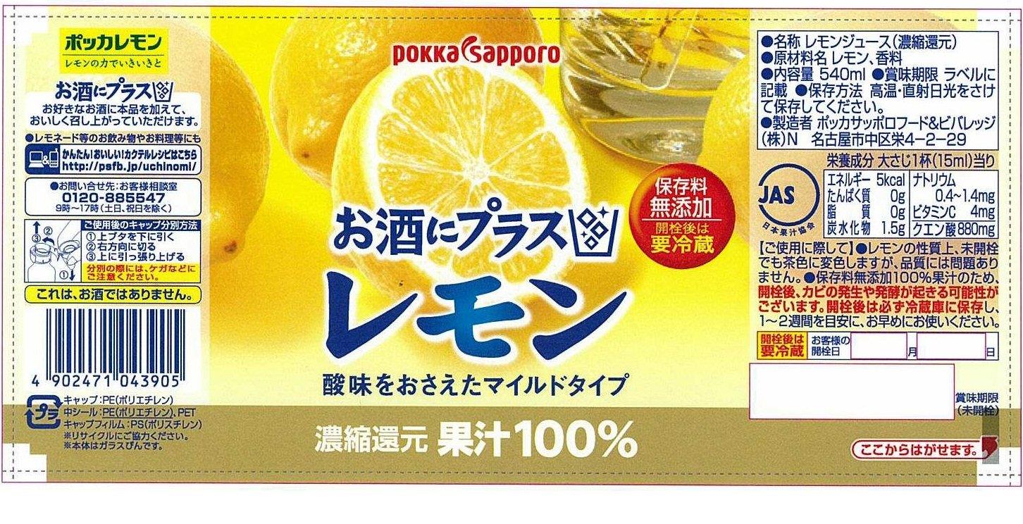 サイズ:540ミリリットル (x 1)◆商品名:ポッカサッポロ お酒にプラス レモン 540ml内容量:540ml保存料無添加の100%レモン果汁原材料:レモン、香料商品サイズ(高さ×奥行×幅):245mm×72mm×72mm原産国:日本お好きなハードリカーにプラスするだけで、果汁感のある本格的なおいしさが手軽に味わえる100%レモン果汁です。説明商品紹介保存料無添加の100%レモン果汁です。切ったり搾ったりの手間が要りません。たっぷり使える600ml。焼酎との相性にもこだわり、酸味を抑えてあります。栄養成分大さじ1杯(15ml)あたり15Kcalお酒にプラス レモンのご紹介 ・お好きなハードリカー(焼酎、ウォッカ、ジンなど)にプラスするだけで、果汁感のある本格的なおいしさが手軽に味わえる、保存料無添加の100%レモン果汁です。お酒に加えて最適なおいしさに仕上がるよう、マイルドな酸味のレモン果汁を使用しています。・おすすめレシピドライレモンサワー材料(1人分)焼酎 60ml、炭酸水 90ml、お酒にプラス レモン 15ml、氷 適宜※計量の単位は、カップ1は200ml、大さじ1は15ml、小さじ1は5mlです。作り方氷を入れたグラスに、焼酎と炭酸水を4:6で割って、その1割程度のお酒にプラスレモンを加えてお楽しみください。すっきりとした、ドライな味わいが楽しめます。原材料・成分レモン、香料