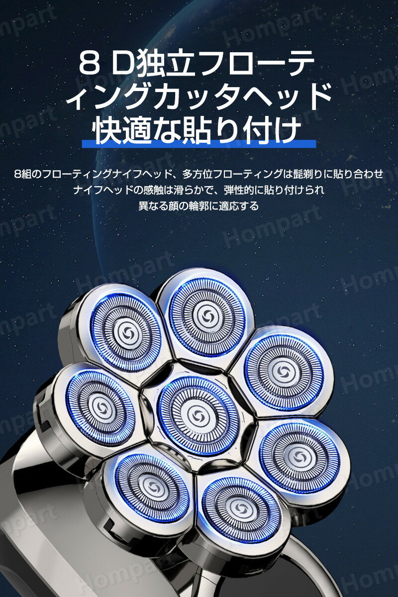 8枚刃電動シェーバー メンズ ひげそり 男性 スキンヘッド シェーバー メンズ 多機能 6in1防水 シェーバー 髭剃り ヒゲトリマー バリカン 鼻毛カッター 洗顔ブラシ 回転式 電動カミソリ 水洗い 乾湿両用 IPX6防水 お風呂剃り可 USB充電式 LEDディスプレイ 父の日 誕生日祝い