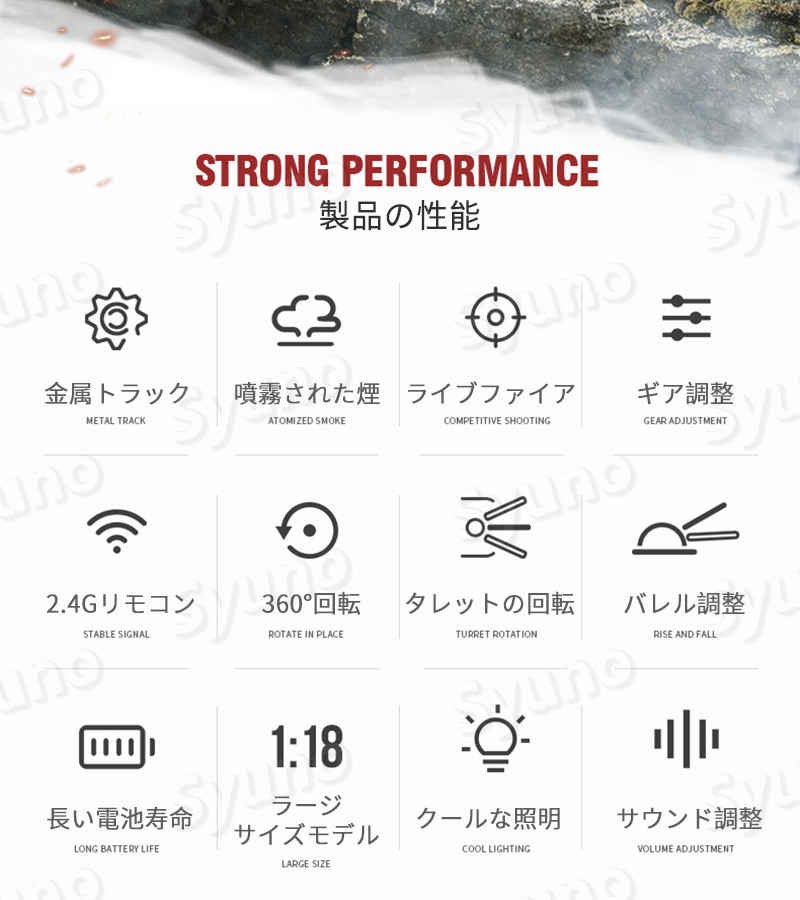 リモコンタンク情報 製品名:リモコンタンク シミュレーション比:1:18 製品材料:合金/プラスチック/電子部品 リモコン信号:2.4GHZ 駆動力:7.4V充電式リチウム電池 リモコン電源:AA電池3本 充電方法:USB充電ケーブル充電 対象年齢:6歳以上 製造国:中国 梱包サイズ:約50 * 22.5 * 30.5CM 製品スタイル:ドイツのタイガー/ドイツのレオパルト2A6 /アメリカのM1A2 /ロシアのT90 製品機能:金属トラック/実弾/同じプラットフォームでの戦闘/霧化された煙/シミュレーションの反動 ご注意: 該当商品には技適マークが貼付されていなくて 日本国内で使用すると電波法違反になるおそれがあり、予めご了承くださいませ。