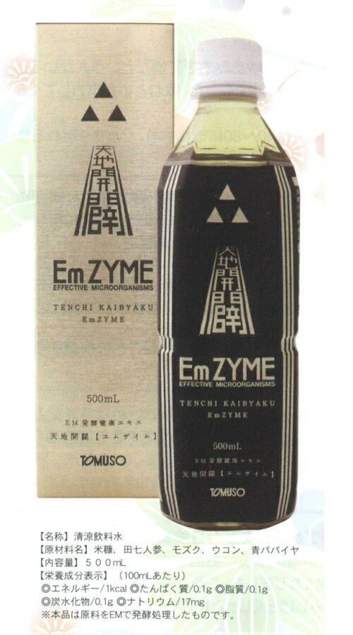 【名称】清涼飲料水 【原材料名】米糠、田七人参、モズク、ウコン、青パパイヤ【内容量】500ml 【栄養成分表示】(100mlあたり) ◎エネルギー/1kcal ◎たんぱく質/0.1g◎脂質/0.1g◎炭水化物/0.1g ◎ナトリウム/17mg ※本品は原料をEMで発酵処理したものです。 【製造】有限会社サン興産業天地開闢EmZYME(エムザイム) 全ての人が身体の芯から健康で、 毎日を健やかに笑顔で過ごしてほしい。 この想いから天地開闢エムザイムが誕生しました。 EMという微生物の助けを借り、原材料は厳選された「田七人参」をはじめ、「モズク」、「春ウコン」、「米糠」、「青パパイヤ」を使用し、じっくりと発酵・ 熟成して抽出しました。 【名称】清涼飲料水【原材料名】米糠、田七人参、モズク、ウコン、青パパイヤ【内容量】500ml【栄養成分表示】(100mlあたり) ◎エネルギー/1kcal ◎たんぱく質/0.1g ◎脂質/0.1g ◎炭水化物/0.1g◎ナトリウム/17mg※本品は原料をEMで発酵処理したものです。 田七人参 田七人参には血圧に影響するサポニンが含まれています。 クルクミン クルクミンはウコンに含まれるポリフェノールです。強い抗酸化力があります。 フコイダン 1996年に開催された第55回日本癌学会で研究成果が発表されています。 パパイヤ酵素 私達が果物として食べている熟した黄色いパパイヤには、パパイヤ酵素が含まれていないそうです。 青パパイヤには、脂肪分解機能のリパーゼたんぱく質分解機能があるプロテアーゼ、糖分分解機能のアミラーゼなど、多くの酵素が含まれています。 米ぬか 米ぬかには(イノシトール)ビタミンBの一種(フィチサン)が含まれています。 米ぬかに含まれる豊富な栄養成分の中で、特に注目を集めているのが「イノシトール」とフィチン酸」と呼ばれる化合物です。 その他、米ぬかには強力な抗酸化作用を持つといわれる「フェルラ酸」も含まれています。 【ご飲用の目安】 1日あたり10〜30mlを目安にお飲みください。そのままか、お水やお茶などに混ぜてお飲みいただいてもかまいません。また、炊飯やみそ汁などお料理にも御利用いただけます。 【保存方法】〈未開封〉直射日光や高温多湿を避けて保存して下さい。〈開封後〉必ず冷蔵庫にて保管して下さい。また、保存料は使用しておりませんので、 開封後1ヶ月以内を目安にお召し上がりください。