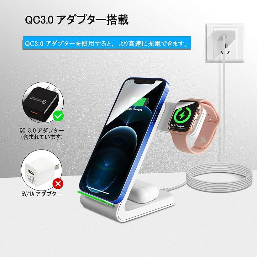 商品コード2b4iuqv9ji商品名互換品WINGO TIMES ワイヤレス充電器3in1 15W急速 置くだけ充電 Apple Watch/Airpods充電対応 iphone8 /Samsung Galaxy S6以降など qi機種対応 白ブランドFmlyhomカラー白・「3in1ワイヤレス充電器&優れた整理性」WINGO TIMESのこの充電器でiPhone、Apple Watch、AirPods を高速か3つ同時に充電できます。Watchがずれないように、磁気吸引機能はWatchの充電位置に設定されているので、安心してお使いいただけます。Airpodsケース充電エリアは挿し抜き式ではなく、本当の意味でのワイヤレス充電器です。ご注意:購入する前に、ぜひごAirpodsケースは無線充電機能を搭載することを確認してください」本製品はそんな面倒な配線接続の必要が無く、一本の配線で使用できます。・「多様な機種に対応」Airpods2/3/pro対応、Apple Watch2/3/4/5/6/7/SE対応、 iPhone 13 /13pro/13 Mini /iPhone 12 / 12pro /12 Mini / 11 / 11pro / 11 promax / Xs / X / XR / 8 / Galaxy S20 / S10 / S10+ / S9 / S9+ / S8 / S8+などqi機種対応可能です。注意: iPhone12 miniについて、本機種のサイズが小さくて、内蔵バッテリーが右下に設計しているため、縦置きで充電する場合、充電できない、または充電速度が遅い場合は、スマートフォンの下に 1 ~ 2cm のパッドを置いてください。他のモデルは正常に充電できます。・「高品質の素材とデザイン」本体はマットな質感のABS素材でとても滑らかな手触りで、見た目は高級ですが、スマートフォンを傷つける心配もありません。こちらの「3in1 ワイヤレス充電器」Apple Watch 磁気充電モジュールは、90° 回転してホストの後ろに隠すことができます。必要なときに広げて、会社やご家庭での使用に最適です。友人へのギフトとしても良い選択です。・「Quick Charge 3.0急速充電」iPhoneを充電する電力は最大7.5W、Galaxyを充電する最大電力は10W/15Wで、変換効率は75%です。この速度は従来の速度よりも 10% 速く、充電時間を30分短縮でき、何度も電源に接続する心配がなく、おくだけ充電できます。(注意:より高速で安定した充電のために、付属の 18w-QC3.0 アダプターを使用してください。)・「品質」温度制御機能、自動充電停止、異物、金属物識別等機能も備えて、金属物を置いて呼吸ライトすぐに点滅し、スマホの安全を確保します。※ 他ネットショップでも併売しているため、ご注文後に在庫切れとなる場合があります。予めご了承ください。※ 品薄または希少等の理由により、参考価格よりも高い価格で販売されている場合があります。ご注文の際には必ず販売価格をご確認ください。※ 沖縄県、離島または一部地域の場合、別途送料の負担をお願いする場合があります。予めご了承ください。※ お使いのモニタにより写真の色が実際の商品の色と異なる場合や、イメージに差異が生じることがあります。予めご了承ください。※ 商品の詳細(カラー・数量・サイズ 等)については、ページ内の商品説明をご確認のうえ、ご注文ください。※ モバイル版・スマホ版ページでは、お使いの端末によっては一部の情報が表示されないことがあります。すべての記載情報をご確認するには、PC版ページをご覧ください。「素晴らしい互換性」*対応機種:* iPhone 13/13pro/iPhone 12/12 Pro/12 Mini/SE2/iPhone 11/pro/pro max/iPhone 8/8Plus/iPhone X/XS/XR/X Max*Apple Watch 2/3/4/5/6/7/SE*Airpods 2/3/Proワイヤレスケース*Galaxy S20/S10/S10 Plus/S9/S9 Plus/Note8/S8/S8 Plus/S7/S7 Edge/S6 Edge Plus*Qiスマホ機種(最新版のiPhone 13/13pro、Apple Watch7とOS7.0システム対応です。)*「*ご注意」純正のApple製Airpodsケースだけ対応します、それ以外のケース製品は暫く対応できません。*「*注意」スマホが大きい場合は、横向きにしか充電できません。たとえば、iphone12 pro max/iphone13 pro max。「QC3.0急速充電」18W/9V/2A規格のQC3.0高効率の充電アダプターを使って、出力パワーが全部15W-5Wです。理論値80%以上の出力パワーができます。三つのコイルが搭載されているため、通常のワイヤレス充電器より広い充電面積をカバーできます。15W、10W、7.5W、5Wの4つの充電パターンがあり急速充電にも対応、高い互換性があるため、iPhoneやAndroid等幅広い機種に対応しています。*急速充電には「Quick Charge3.0」対応のUSB充電器が必要です。(QC3.0アダプター付き)「注意」突然充電できない場合は、iOSシステムがアップデートされたばかりの可能性があります。スマートフォンを再起動することをお勧めします。「置くだけで充電&両方向充電可能」在宅勤務時のテレビ会議する機会が増えてきます。本製品は縦・横の方向に縛られることなく、充電しながら長時間テレビ電話が可能です。スマートフォンに届くプッシュ通知も見逃しにくく、電話がかかってきてもすぐに受けられます。自宅でウェブサイトの閲覧・動画視聴を見ながら、運動してもスマートフォンの電源が切れる心配はありません。「保護機能」スマートフォンの安全を確保するために、過電流、過充電、過電圧、過熱、温度制御、充電の自動停止、異物や金属物の認識など、複数の保護機能を搭載しています。寝ている時も外出中