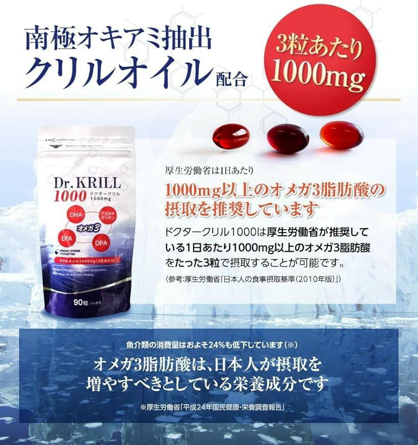 バリエーションコード : 2b62tdg2uv商品コード2b62tr3th8商品名1000mg オメガ3脂肪酸 南極オキアミ クリルオイル サプリメント 90カプセル 30日分 2袋ブランドドクタークリルサイズ等90個 (x 2)「3粒中に1000mgの南極オキアミ抽出クリルオイルを配合」ドクタークリル1000は1粒に335mgのクリルオイルを配合しています。そのため、1日あたり3粒お召し上がりいただくことで、厚生労働省が推奨している1日あたり1000mg以上のオメガ3脂肪酸を摂取することが可能です。(参考:厚生労働省「日本人の食事摂取基準(2010年版)」)厚生労働省が発表する「平成24年国民健康・栄養調査報告」によると、 2000年から2012年の間に、魚介類の消費量はおよそ24%も低下していることがわかっています。オメガ3系脂肪酸は、日本人が摂取を増やすべき栄養成分として、厚生労働省が摂取目標量を定め、推奨している成分です。「地球上で化学汚染が少ない海域で育った南極オキアミは有害物質が蓄積されにくい」ドクタークリル1000の原材料として使用しているオキアミが棲息している南極海は、地球上において化学汚染が少ない海域と言われています。オキアミはこのクリーンな南極の海で植物プランクトンの生み出した太陽光からの第一次生産エネルギーを主栄養素としているため、不純物をため込むサイクル自体が存在しません。クリルオイルの原料となる南極オキアミはさまざまな海の生物の生命を支える生態系の最下層にあたるため、食物連鎖による生態濃縮の危険性が低く、有害物質が蓄積されにくいと言われています。「フィッシュオイル(魚油)とクリルオイルの大きな違い」青魚など魚から抽出したものがフィッシュオイル(魚油)、南極オキアミから抽出したものがクリルオイルです。魚油は一般的に黄色を帯びたオイルですが、クリルオイルはアスタキサンチンの赤色をしています。オメガ3系脂肪酸であるDHA・EPAは魚油(フィッシュオイル)にも含まれていますが、クリルオイルは魚油に比べて非常に多くのリン脂質を含んでおり、このリン脂質が乳化剤のような働きをし、水溶性を高めています。フィッシュオイルよりもクリルオイルに含まれるDHA・EPAの方が水に溶けるという性質があります。「飲みやすい大きさのソフトカプセルでクリルオイル(オキアミ)特有の匂いを完全に除去」外国製のサプリメントは1粒あたりの含有量が多いですが、そもそもカプセルのサイズが大きくて飲み込みにくいという感想をもつ方が多いです。うまく飲み込めたとしても喉に引っかかっているような感覚が残ってしまうというご意見を多くいただきました。そのため、ドクタークリル1000のソフトカプセルは外国人と比較して喉が細い日本人でも飲みやすいカプセルサイズを採用しました。さらに南極のオキアミを原料としたクリルオイルには特有の強烈な匂いがありますが、ドクタークリル1000はその匂いをソフトカプセル内に完全に閉じ込めることに成功しました。そのため、パッケージを開封しても全く匂いがしませんので、職場や旅行などの外出先に気軽に持ち運ぶことが可能です。「クリルオイルに含まれるアスタキサンチンがDHA・EPAの働きをサポート」クリルオイルは赤い色をしていますが、この赤色は南極オキアミの赤い部分によるもので、アスタキサンチンを含んでいます。アスタキサンチンは、トマトのリコピンやニンジンのベータカロチンと同じカロチノイドの仲間で、還元力が高いことで知られています。アスタキサンチンが注目される理由は、還元力がベータカロチンの約40倍、ビタミンEの約1000倍という実験結果もあると言われているためです。このアスタキサンチンが含まれていることも、他のフィッシュオイル(魚油)との大きな違いです。オメガ3系脂肪酸であるDHA・EPAはもともと酸化しやすい成分ですが、アスタキサンチンが含まれていることにより、DHAやEPAのパワーをしっかりサポートしています。※ 他ネットショップでも併売しているため、ご注文後に在庫切れとなる場合があります。予めご了承ください。※ 品薄または希少等の理由により、参考価格よりも高い価格で販売されている場合があります。ご注文の際には必ず販売価格をご確認ください。※ 沖縄県、離島または一部地域の場合、別途送料の負担をお願いする場合があります。予めご了承ください。※ お使いのモニタにより写真の色が実際の商品の色と異なる場合や、イメージに差異が生じることがあります。予めご了承ください。※ 商品の詳細(カラー・数量・サイズ 等)については、ページ内の商品説明をご確認のうえ、ご注文ください。※ モバイル版・スマホ版ページでは、お使いの端末によっては一部の情報が表示されないことがあります。すべての記載情報をご確認するには、PC版ページをご覧ください。「お召し上がり方」健康補助食品として1日2~3粒を目安にお召し上がりください。体調に合わないと思われる場合は、お召し上がりの量を減らすか、又は中止して くだ