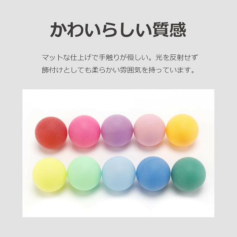 商品コード2bjduknhgi商品名ピンポン玉 卓球ボール カラフル 無地 娯楽用 手芸用 プラスチック ボール 大容量 メッシュ付 40mm アソート 50球ブランドlifactlab.カラー多彩「手芸やイベントに」ピンポンライトの工作や、ビンゴのくじ引きに大活躍。おもちゃやインテリアの飾付けとしても楽しめます。サイズは標準的なピンポン玉と同じ40mm。試合には向きませんが手に馴染む汎用性の高いサイズです。「かわいらしい質感」マットな仕上げで手触りが優しい。光を反射せず飾付けとしても柔らかい雰囲気を持っています。「メッシュバッグ付き」遊び終わった後も散らからずに保管できるメッシュバッグ付き。中身も見えてとても便利です。「製品仕様」直径:約40mm 材質:ポリプロピレン 重量:約2.4g カラー:ランダムアソート※ 他ネットショップでも併売しているため、ご注文後に在庫切れとなる場合があります。予めご了承ください。※ 品薄または希少等の理由により、参考価格よりも高い価格で販売されている場合があります。ご注文の際には必ず販売価格をご確認ください。※ 沖縄県、離島または一部地域の場合、別途送料の負担をお願いする場合があります。予めご了承ください。※ お使いのモニタにより写真の色が実際の商品の色と異なる場合や、イメージに差異が生じることがあります。予めご了承ください。※ 商品の詳細(カラー・数量・サイズ 等)については、ページ内の商品説明をご確認のうえ、ご注文ください。※ モバイル版・スマホ版ページでは、お使いの端末によっては一部の情報が表示されないことがあります。すべての記載情報をご確認するには、PC版ページをご覧ください。