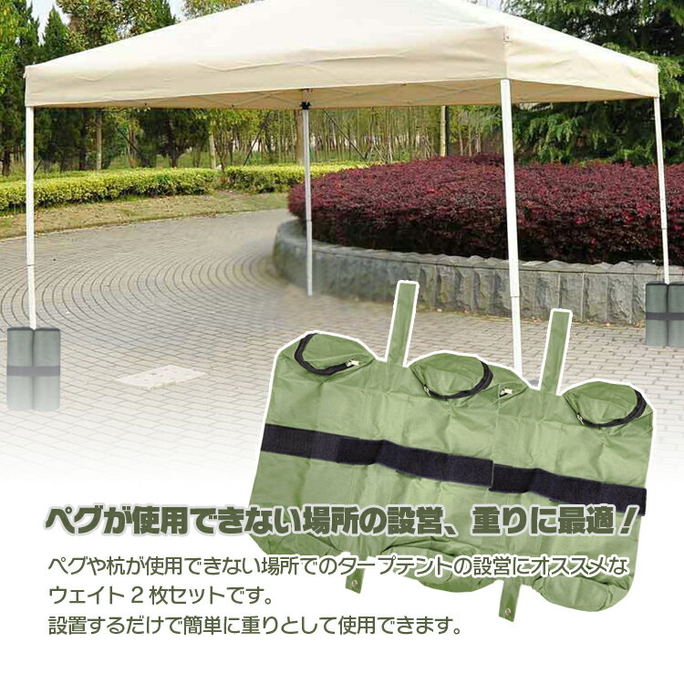 ◆送料について ゆうメール(または定形外郵便) 限定送料無料!(代引きはゆうメール不可) ※発送方法は選択出来ません。 ※メール便(または定形外郵便)配送商品について ※メール便、定形外、ゆうパケットなどポスト投函の発送方法について運送会社および弊社の紛失・破損保証は御座いません。 ◆メール便配送商品について ※当商品はメール便送料無料でご提供させていただいております。メール便につきましてはサイズ制限があるためパッケージなしの簡易梱包での発送をしております。予めご承知頂けますと幸いです。 ゆうメール(または定形外郵便)配送商品は基本的に 追跡なし、ポスト投函での配送となります。 また、万が一サイズ等の理由でポスト投函が出来なかった場合、不在届が投函されます。 その際に長期間ご連絡がない場合、当店への返送が行われます。 再配達には追加料金がかかることになりますので、予めご了承の程お願いします。 当店より発送後1週間が経過しても商品が到着しない等の場合、まずはポストの方をご確認ください。 不在票がございましたらお近くの配送会社営業所へご連絡下さい。 ■並行輸入商品のご注文に関しての注意事項■ ※輸入品の為、外装や本体に輸送に伴う傷やスレ、破れや潰れなどある場合がございます。 ※パッケージ外装の損傷等(商品本体に影響がない場合)による理由での返品交換は受け付けておりませんことご了承下さい。 ※パッケージは付属しない場合がございます。 ※取付及び使用方法のサポートはございません※生産ロットによりロゴデザインの変更、ロゴが無い場合がございます。 ※取付や使用によるトラブル等に関し弊社の保障は一切ございません。 ※仕様やデザイン、パッケージ等は予告なく変更される場合がございます。 ※製造時期により外観や仕様に若干の変更がある場合がございます。予めご了承ください。 ※海外輸入品のため、多少サイズおよび現物と出品画像には誤差がある場合がございます。商品説明 ・ペグが使用できない場所のタープテントの重りに最適です。 ペグが使用できないコンクリートや地盤が硬い場所でのタープテントの設営等にオススメなウェイトセットです。 三脚、のぼり旗の重りとして様々な用途でご利用頂けます。 ・砂を入れるだけで簡単にご利用できます。 砂がない場所では水を入れたペットボトルでも代用ができます。 ※直接水を入れることはできません。 ・水を弾きやすく丈夫なオックスフォード生地なので長持ち。 【商品仕様】 材質:オックスフォード生地 サイズ:41.5cm×40cm(幅×高さ) タイプ:ファスナー&マジックテープ(固定) 容量:両側で約8Lの充填物入り可能/砂の場合約13Kg ※砂などの充填物は別途ご用意ください。 カラー:モスグリーン セット内容:ウエイトバッグ2枚 ご注意事項 ※出品物はウエイトバッグ2枚セットのみとなります。その他のものは付属しておりません。 ※海外の工場での縫製となるため、縫製の見劣り・糸のほつれなどある場合があります、ご購入前に予めご了承ください。 ※日本語説明書は付属しません。また、使用方法についてのサポートはいたしかねます。 ※当商品を使用した際に起こった事故や破損等の損害については一切の補償をいたしかねます。 ※輸入品の為、輸送に伴う傷やスレ、小さな汚れなどが包装や本体にある場合がございます。 ※生産ロットによりデザイン、ロゴが無い場合がございます。 ※製造時期により外観や仕様に若干の変更がある場合がございます。予めご了承ください。 ※ご使用の際は事故のないように、取り扱いには充分お気を付けください。 ※ご使用済みの場合は返品返金対応しかねます。 ※色違い、相性が悪いなどの理由で返品交換は受け付けできません。 ※ご使用のディスプレイにより色合いが違って見える場合がございます。 ◇送料について メール便、または定形外郵便、限定送料無料!(代引きはメール便不可) ※メール便または定形外郵便の配送商品について メール便の配送商品は基本的に 追跡なし、ポスト投函での配送となります。 商品発送より土日祝日を除き3〜7日程度でお届けとなります。 また、万が一サイズ等の理由でポスト投函が出来なかった場合、不在届が投函されます。 その際に長期間ご連絡がない場合、当店への返送が行われます。 再配達には追加料金がかかることになりますので、予めご了承の程お願いします。 商品が到着しない等あります場合、ポストの方をご確認ください。 ※楽天のシステムは追跡番号と連動する都合上、お届けのステータスは「出荷準備中」から変わらない仕様となります。 商品発送の確認は発送メール、購入履歴よりショップからのメール一覧をご確認ください。 ※メール便(または定形外郵便)配送商品について ※メール便、定形外、ゆうパケットなどポスト投函の発送方法について運送会社および弊社の紛失・破損保証は御座いません ■並行輸入商品のご注文に関しての注