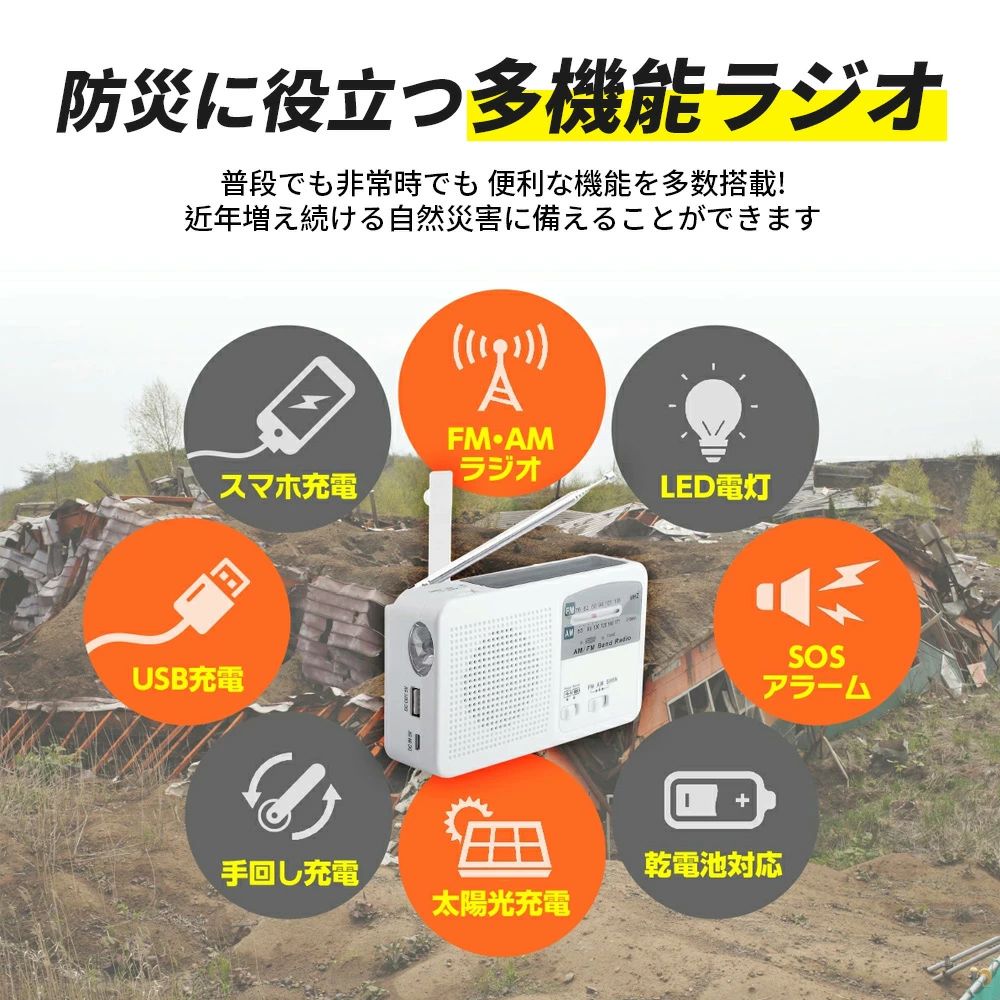 防災ラジオ ポータブルラジオ 防災グッズ AM/FM ラジオ 懐中電灯 SOSアラーム バッテリー機能搭載 非常用 ソーラー発電 太陽光充電 手回し発電 USB充電 乾電池給電 ライト LED 軽量 多機能 日本語取扱説明書付